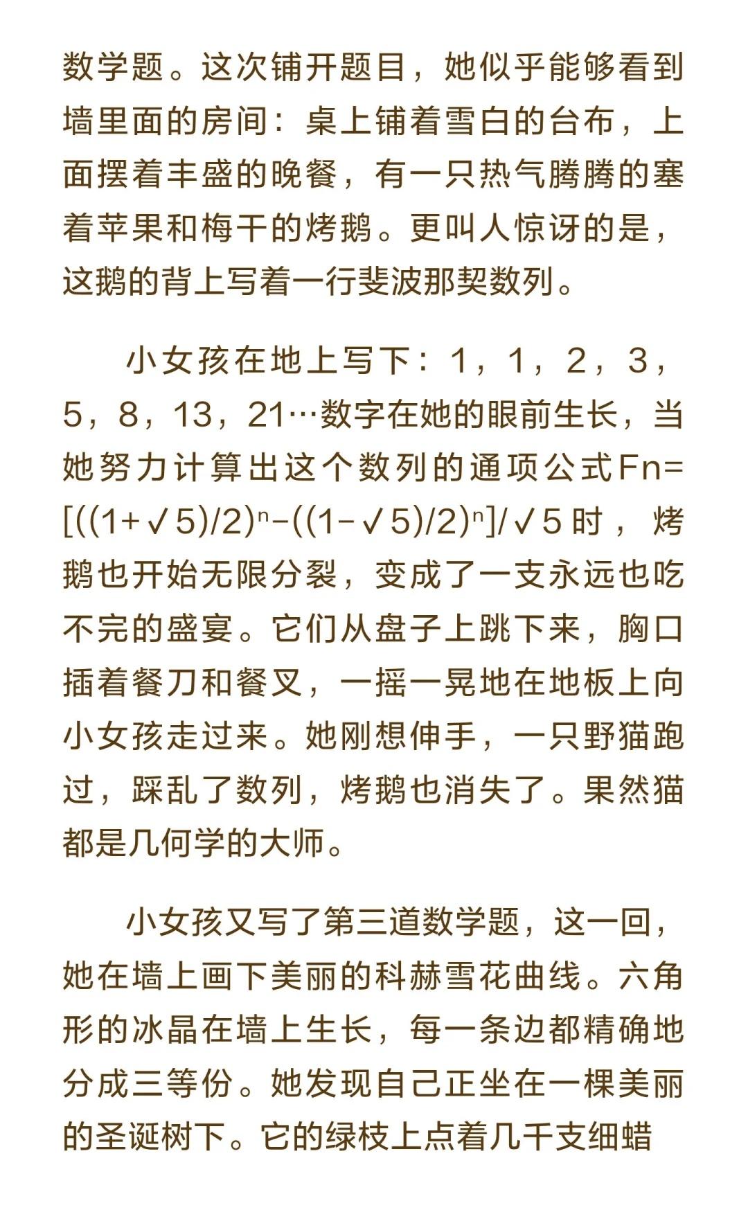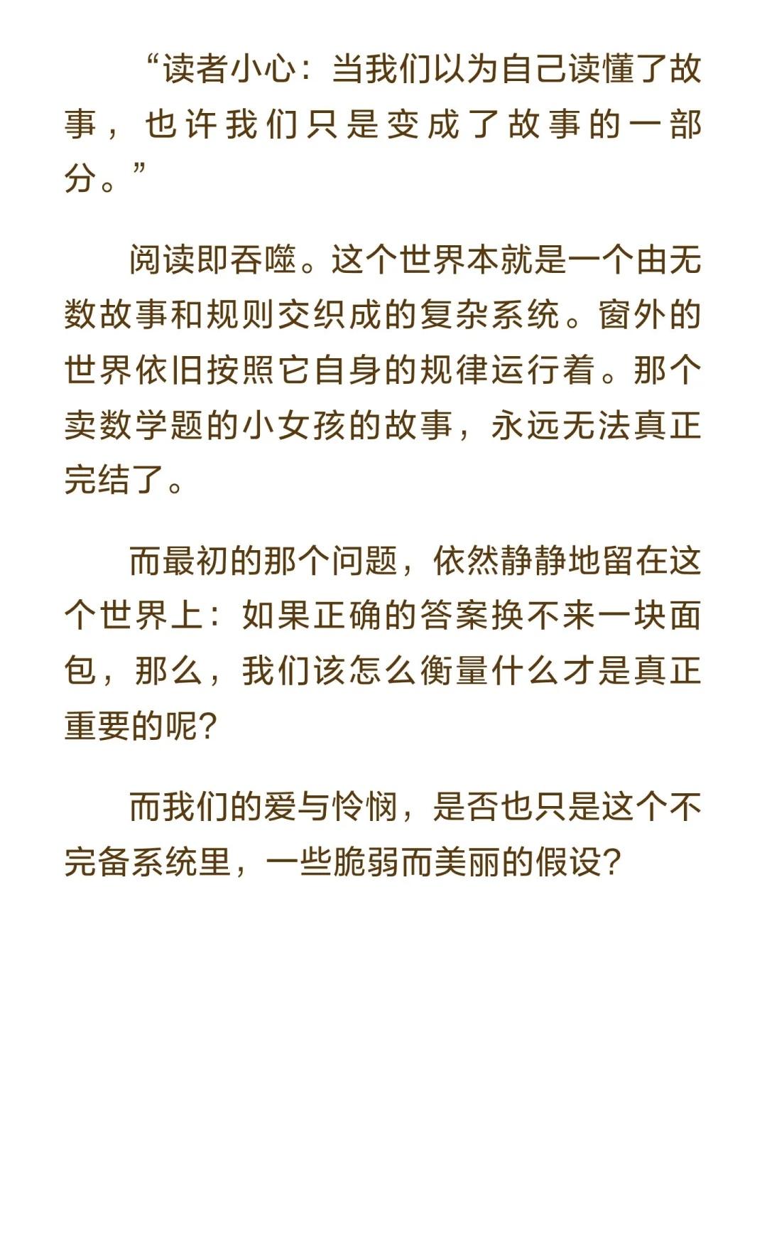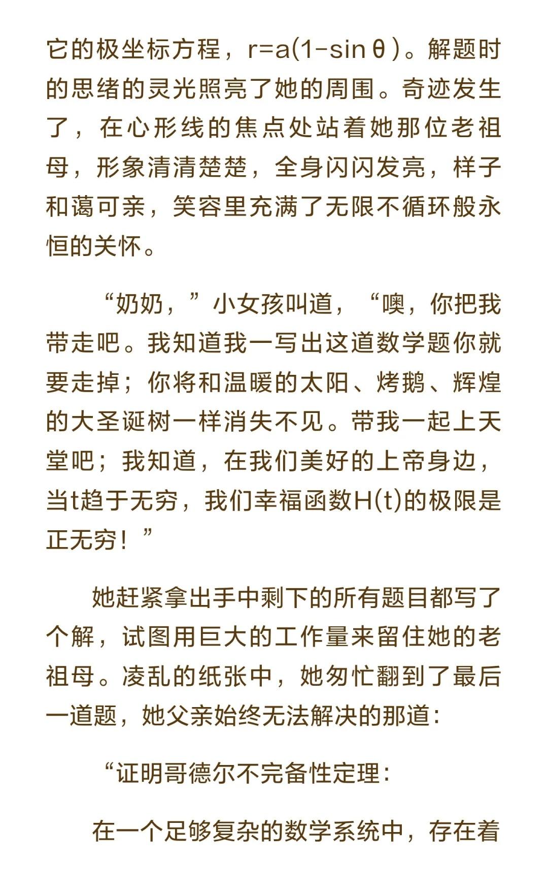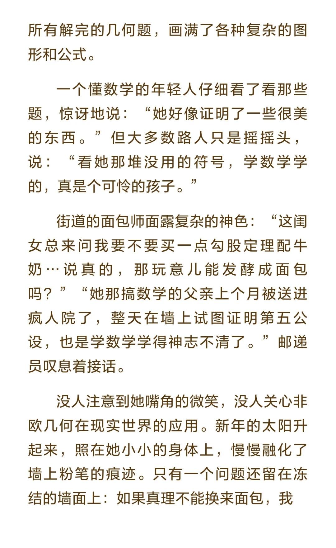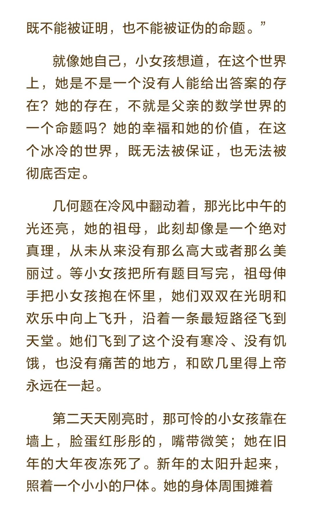 卖数学题的小女孩 🔢🔣 感谢大家厚爱🫶 前几天写了数学版睡美人,好多人说喜欢,想看别的数学故事,所以这两天又写了一篇! (也有好多人说看不懂,其实我写完之后过两天再看也懵懵的,光滑流过大脑) 我自己编了好几个数学冷笑话塞进去哈哈哈哈哈,写的时候笑到好多次,感觉自己是天才来的。 以及其实我是个数学笨蛋啊啊,谢谢大家不嫌弃我四处漏风的知识!感觉大家所有的夸奖,我将打印下来每天读一遍然后带到墓里为我陪葬💤爱你们。 早八的大家加油,考研的大家加油! 请用!🤲 哥德尔不完备性定理:在一个足够复杂的数学系统中,存在既不能被证明,也不能被证伪的命题。 . 数学是人都会 我是人吗 困 数学 高数 童话 几何 事已至此先睡吧 一觉醒来天塌了