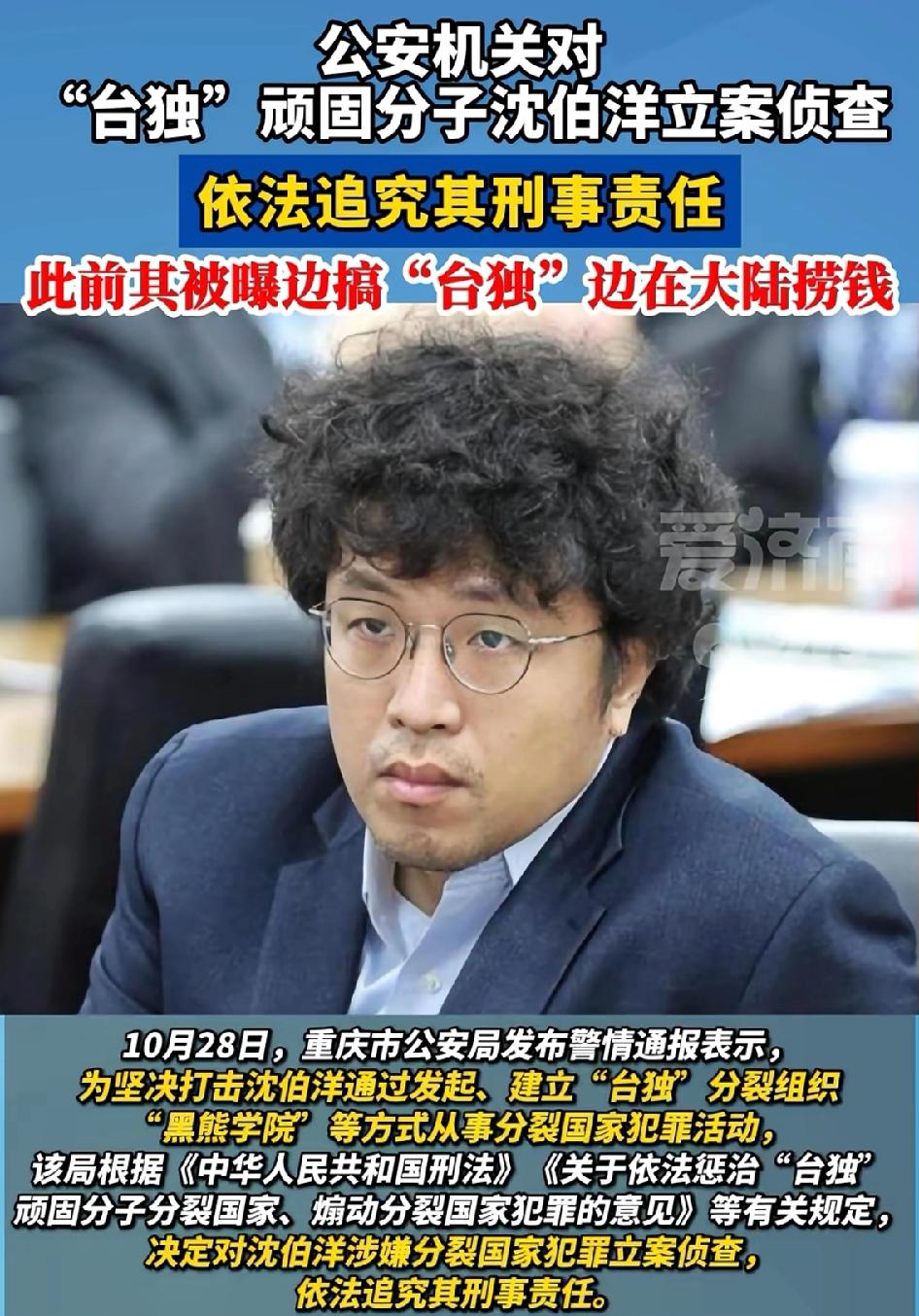 重庆警方对沈伯洋立案侦查,这事儿看得人太提气了!别以为搞“台独”能躲得过,法律的网早就张好了,犯了错就得受罚。 这个沈伯洋真够虚伪的,自己建“黑熊学院”散播“台独”谬论,煽动对立,背地里家人却靠着和大陆的生意赚钱 。去年被列入顽固分子清单,现在立案侦查,每一步都是对“台独”分子的有力警告。 这根本不是针对谁,而是明确告诉那些跳得欢的“台独”分子:分裂国家从来不是“政治立场”,是实实在在的犯罪。国家主权容不得半分挑衅,不管躲在哪个角落,只要碰了红线,迟早要被追责。 现在警方还公开了举报方式,可见打击“台独”是动真格的。你们说,这种零容忍的态度,是不是最能护得住两岸的和平?