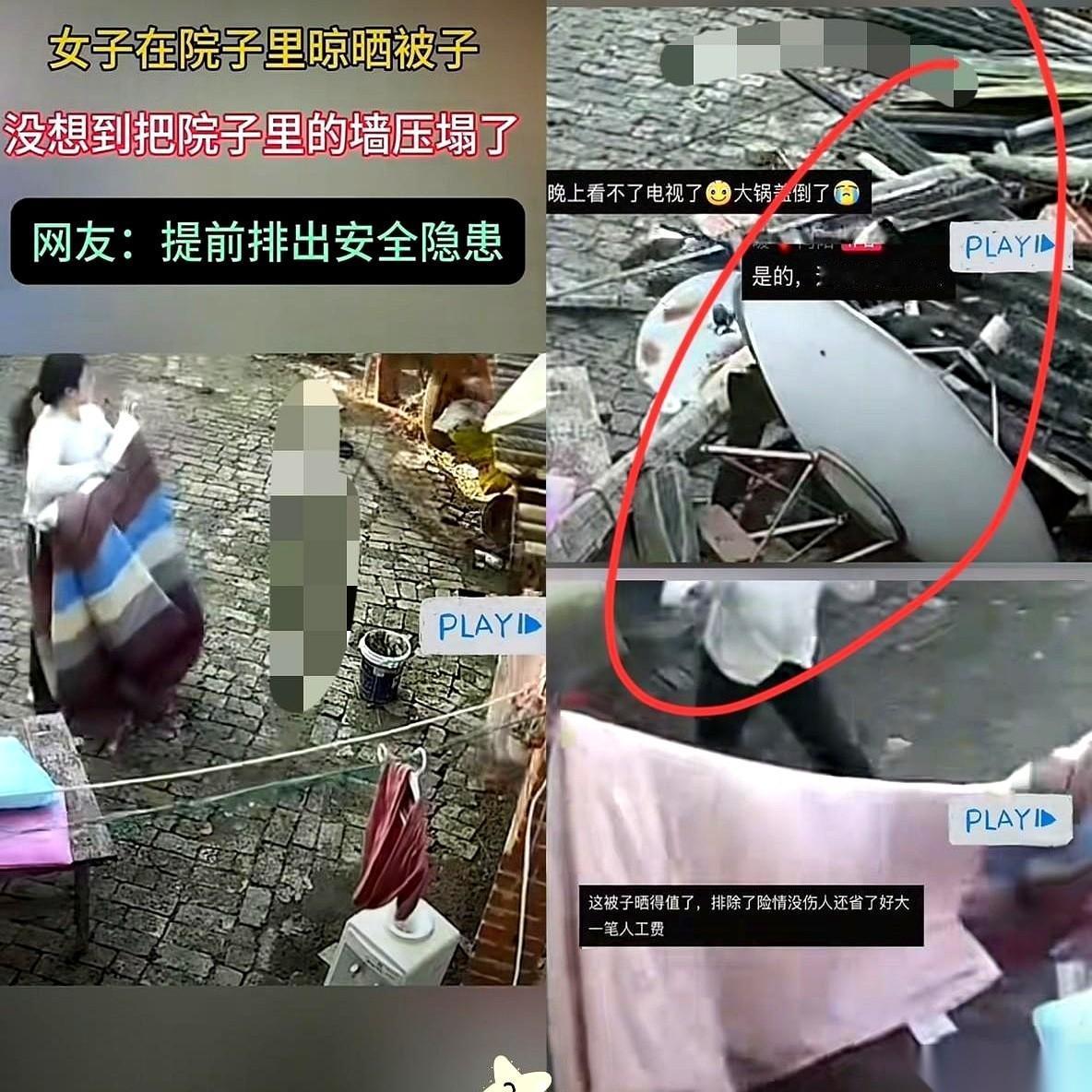 轰隆一声! 刚把被子搭上去,就听见院子里跟炸了一样。 我当时人都是懵的,眼睁睁看着那个晾衣架,连着雨棚,哗啦一下全塌了。墙都给砸了个口子,旁边堆满杂物的架子也散了架。 就差一步。 真的,就差一步。我要是搭完被子顺手往棚子底下走一步,后果我根本不敢想。 现在后背还冒冷汗呢。 哪是什么意外啊,这根本就是“蓄谋已久”的必然。 那个晾衣架的螺丝,松了得有大半年了吧,总想着“回头拧拧”; 那个雨棚,用了快十年了,塑料早就脆了,也想着“明年开春再换”; 还有那个置物架,什么破烂都往上堆,跟个小山似的。 今天这床厚被子,不过是压死骆驼的最后一根稻草,轻轻推了它一把而已。 生活里这种事儿太多了。 “凑合一下”、“明天再说”、“应该没事吧”……我们总拿这些话当借口,亲手给自己的生活埋下一个又一个雷。 等它炸了,才追悔莫及。 真的,都回家看看吧,那些你一直拖着没解决的小毛病。 别把日子过成了“侥幸”的总和。过日子,归根结底,不就图个安稳踏实吗。