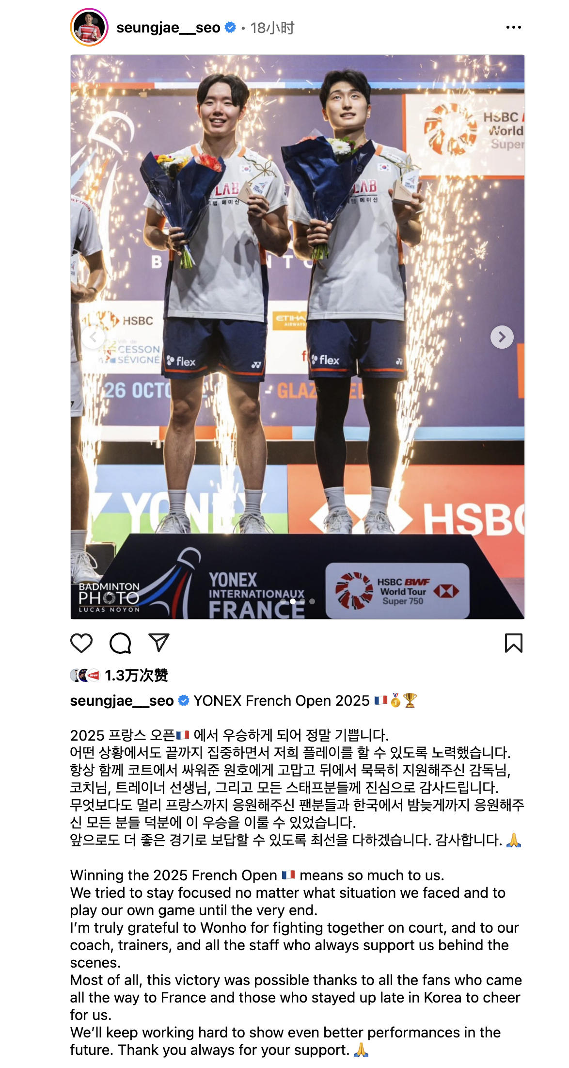 徐承宰赛后发文:能在2025法国公开赛🇫🇷夺冠,我真的超级开心!不管场上发生什么,我们都一直提醒自己“专注到最后一分”,坚持把我们的节奏打出来。