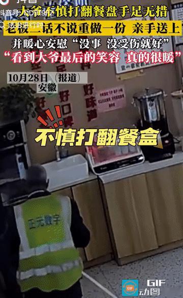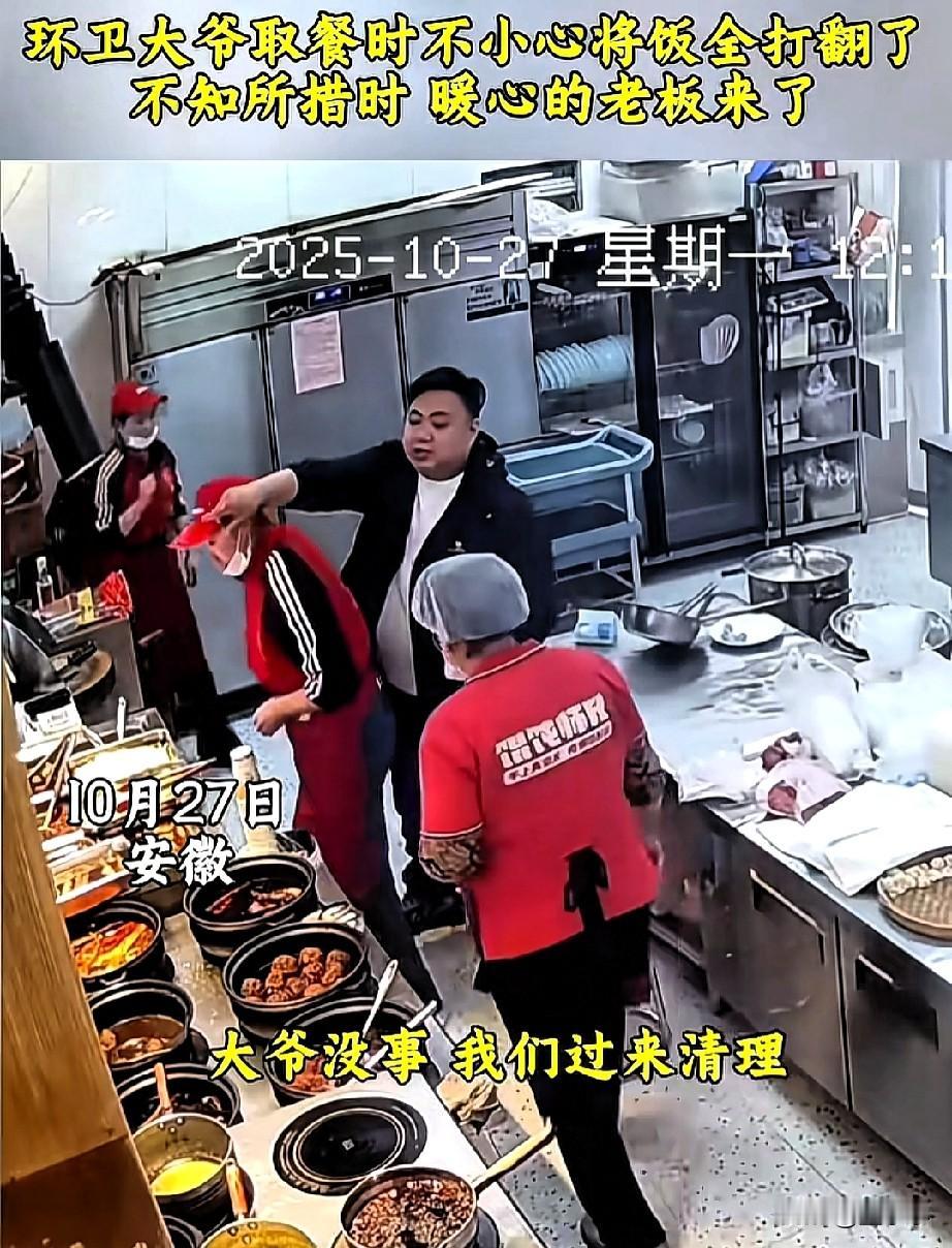 活该人家当老板呀!安徽,大爷在取餐时不慎打翻餐盘,手足无措不知该怎么好,老板看到后不仅安慰大爷,该给大爷重新做了一份,网友: 老板的生意绝对好,做生意人先善良才会有生意。 一位头发花白的环卫工大爷来到一家餐馆吃饭,没想到在取餐的时候,因为手滑了导致餐盘落在地上,大爷很无助,这菜还没有吃都洒地上了。 这时,老板看到了大爷的状况,直接安慰大爷,并且让大爷找个地方坐下,重新给他打一份。 老板很贴心的给大爷打好后,又亲自端了上去,尤其是看到大爷脸上露出的笑容,这一幕真的让人暖心呀。 虽然这一顿饭不值多少钱,但是老板的这个做法,是这一顿饭的钱买不来的[赞] 都是朴实可爱又可敬的老百姓。 也体现了中国人善良的本质。