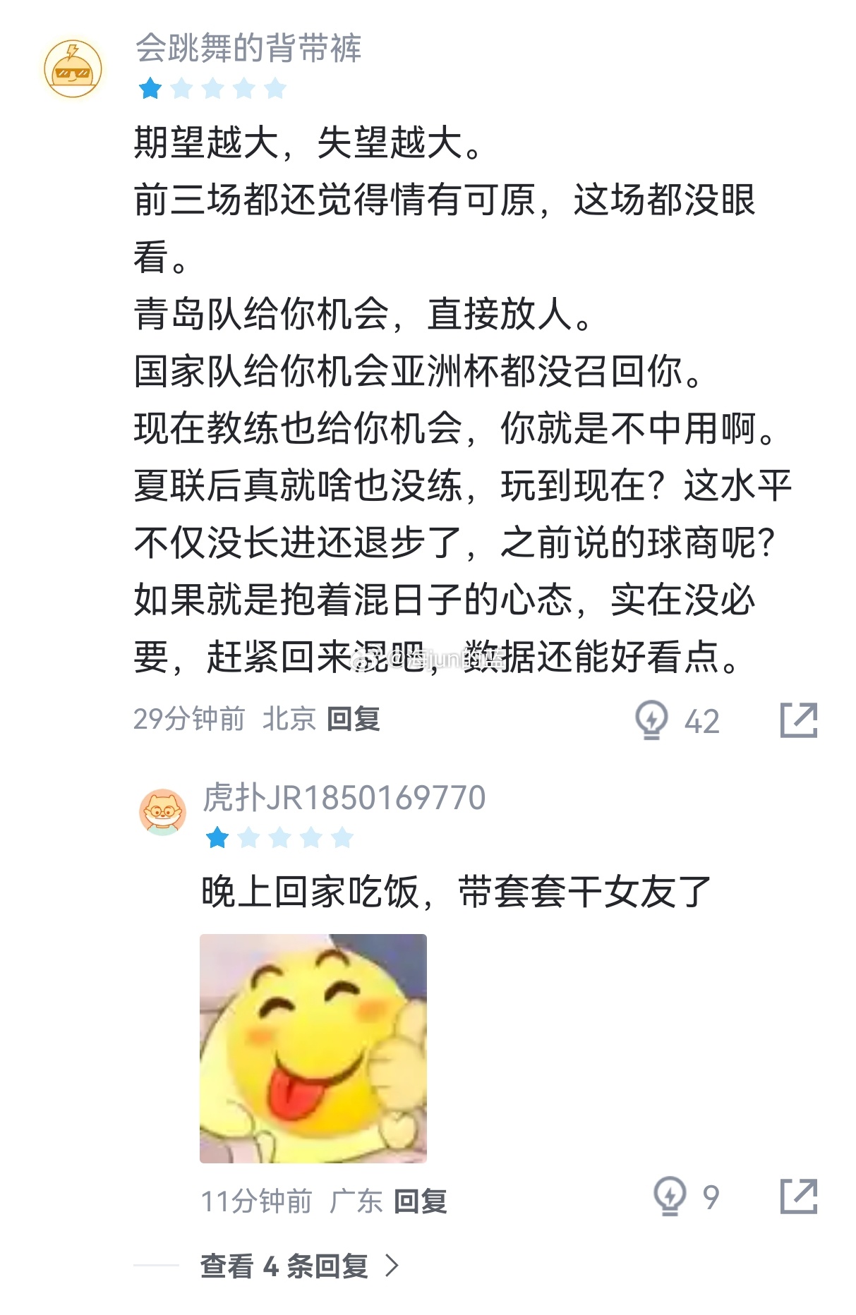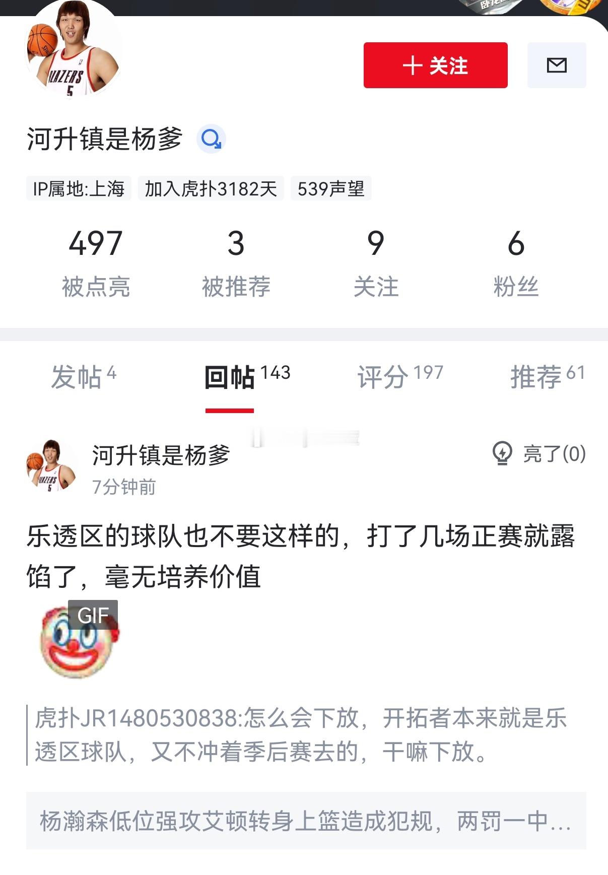 全村的希望在NBA奋斗梦想,我们容忍球迷对瀚森在技术和能力不足方面的批评,但绝不容忍这种侮辱人的行为!还有那些讨论人家女朋友的,还有说去了美国吃胖二十斤,这些远远超出了篮球讨论范畴,完全就是对球员赤裸裸地网暴和人身攻击,真不知道这种败类对小杨有什么深仇大恨。