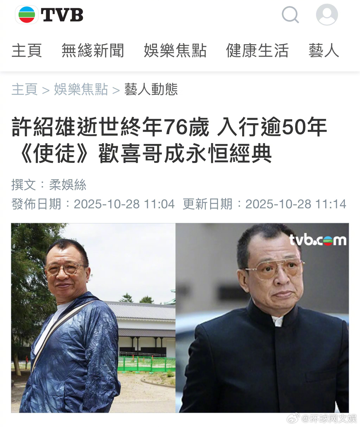 【#欢喜哥许绍雄去世# 】28日早晨,TVB发表讣闻称,资深艺人许绍雄凌晨因癌症引发器官多重机能衰竭安详离世,终年76岁。