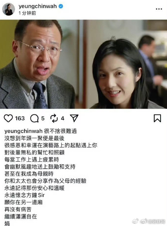 【#杨千嬅悼念许绍雄#】28日,#欢喜哥许绍雄逝世#,在社交平台发文悼念许绍雄:“没想到年头一聚便是最后,很感恩和幸运在演艺路上的起点遇上你,对后辈的无私帮忙和照顾”,“甚至在我成为母亲时,你和太太也会分享作为父母的经验”,“永远怀念方钟sir”,在结尾她署名“娟”。两人曾合作《新扎师妹》《煎酿三宝》,在《新扎师妹》中曾饰演荧幕父女。(中国蓝新闻)