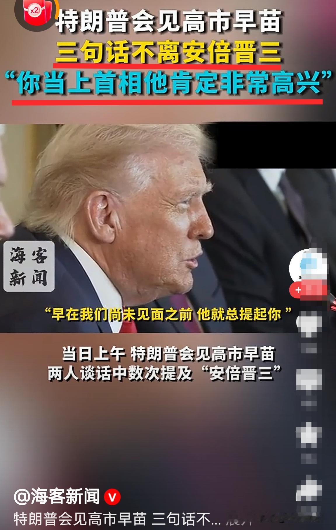 美国总统特朗普对日本首相高市早苗说:你当上首相,安倍晋三肯定非常高兴!你没选上之