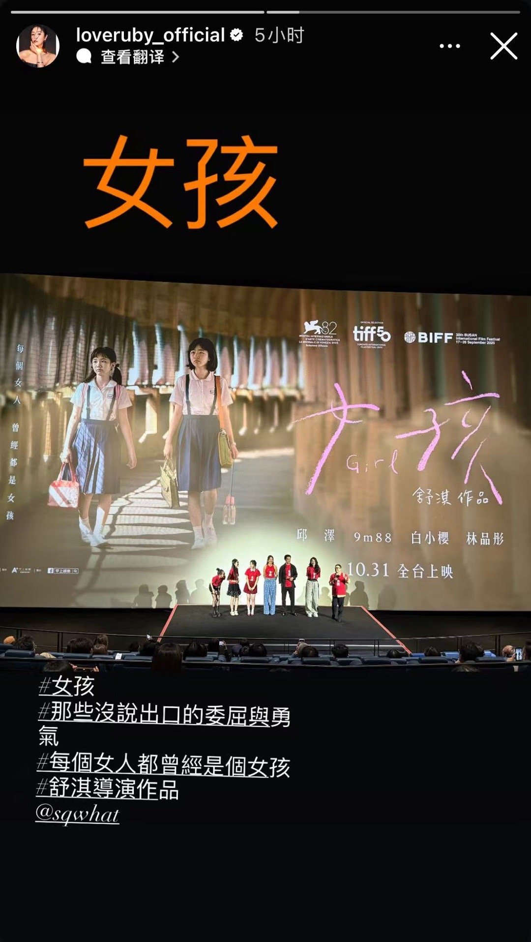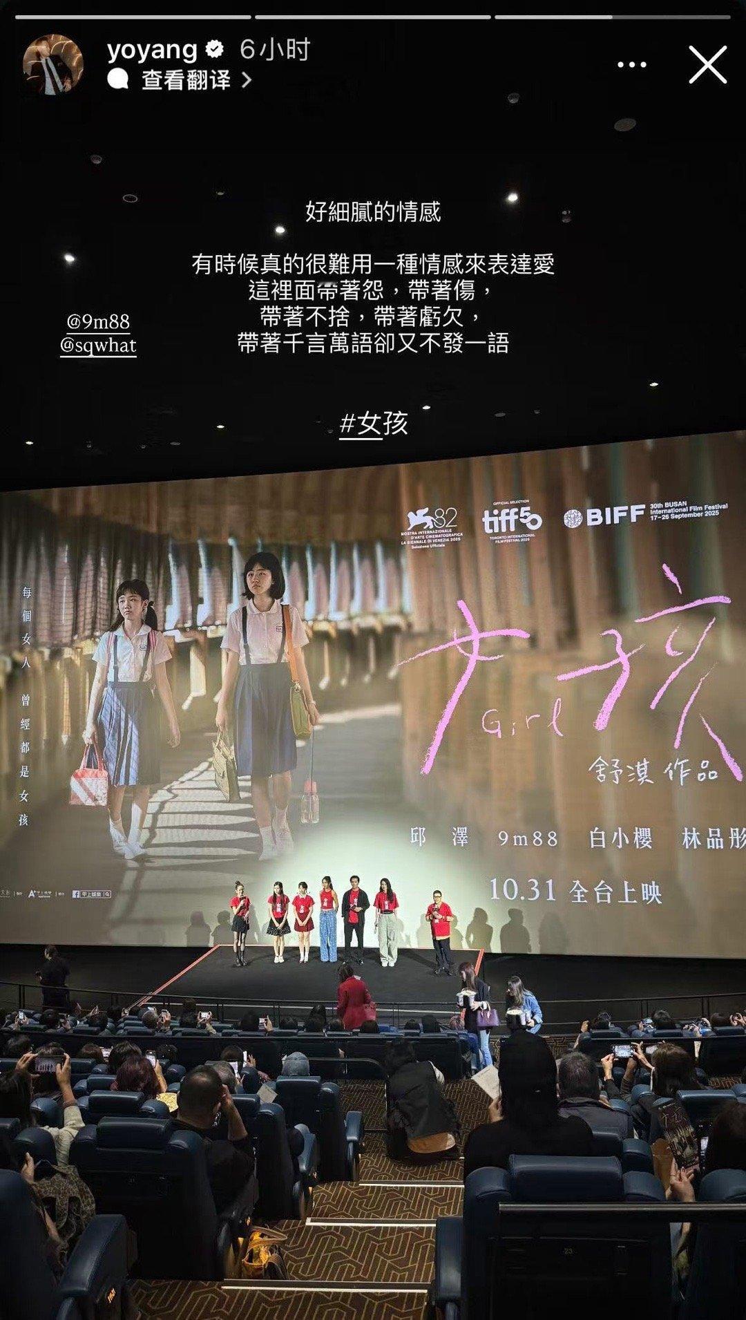 这部电影是舒淇指导的首部电影作品,在三大电影节都完成了闪耀亮相,还刚刚获得釜山电影节最佳导演奖,舒淇拍这部电影就是从自己的成长经历出发,讲一个女孩在原生家庭创伤中长大的故事,包括邱泽、9m88、白小樱、林品彤在内的几乎全部主创都出席了首映礼