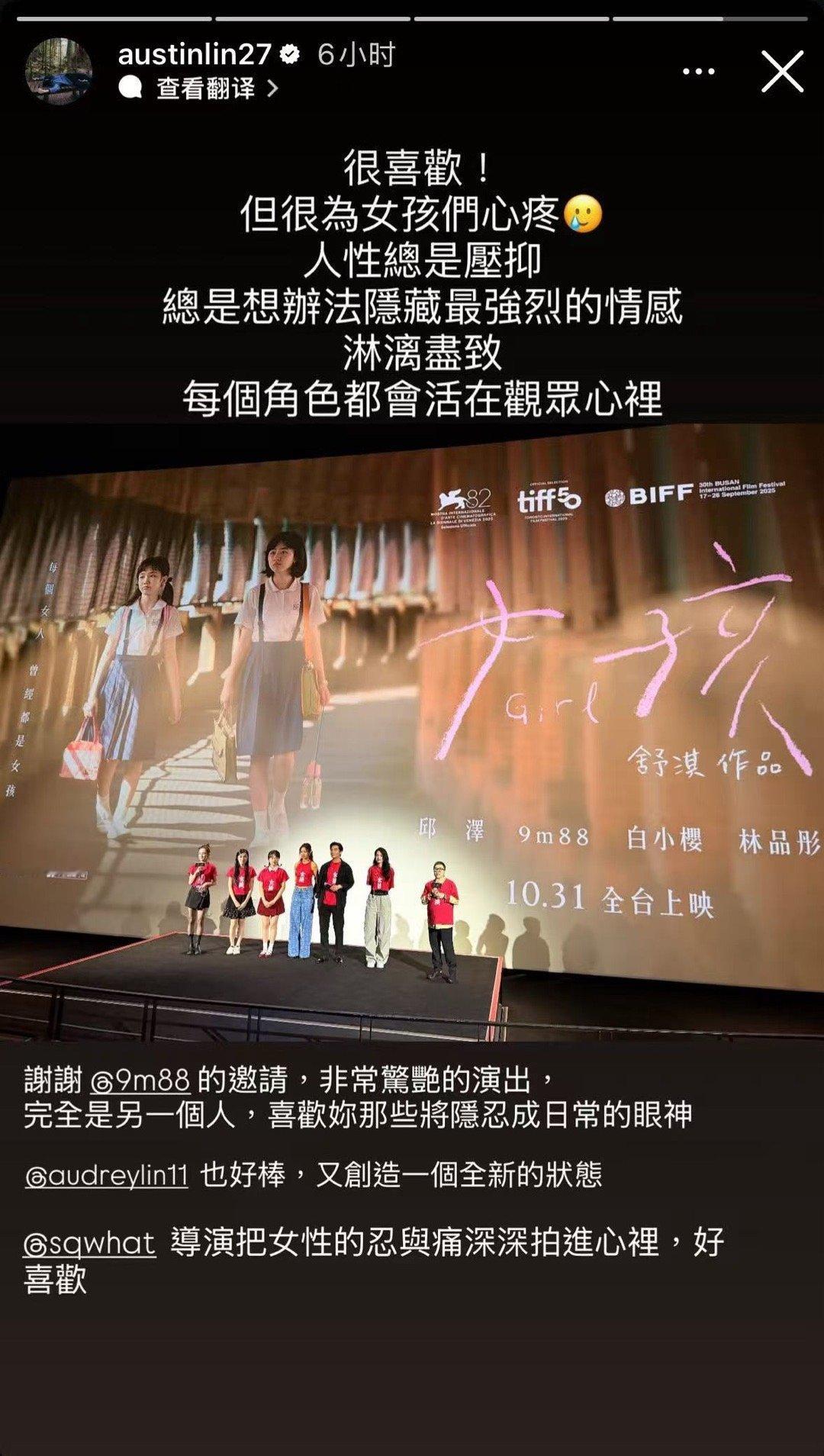 《女孩》昨天抢先在台湾举行了首映礼~从媒体报道和社交网络看,好多艺人都受邀去现场进行了观影,包括张震、林心如、杨祐宁、吴青峰、徐佳莹、林柏宏、林熙蕾、郑宜农等等。舒淇人缘也是真的很好,宣布将在内地上映的时候,好多大牌艺人都来转发支持