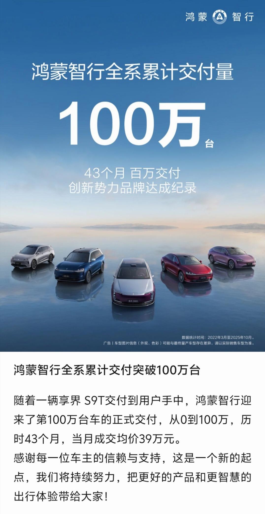 从今天开始,鸿蒙智行正式迈入“百万车主俱乐部”了,鸿蒙智行用户中心也正式成为拥有百万车主的“大饭店”,想象一下,可以让百万车主前来“蹭吃蹭喝”的4S店,还有谁啊? 今天余承东自豪感满满的宣布,鸿蒙智行全系交付突破100万台,并感慨万分地说,从零到百万,仅用了43个月,速度超乎想象!其实我觉得,鸿蒙智行的百万台交付里面,最牛逼的是均价56万的问界M9占了四分之一,自己干了25万台, 不讲武德啊! 原来,在鸿蒙智行这里,时间是有加速度的。别人从看不起,到看不懂,到追不上,成就了余总的封神之路。这一路走来,不容易! 按照成交均价39万算,交付100万台,就是实现营收3900亿元。只要继续保持这个势头,鸿蒙智行五界3年内营收就达到万亿以上的规模,下一个百万台,只会比现在更快。华为入局智驾的鲶鱼效应 余承东 鸿蒙智行