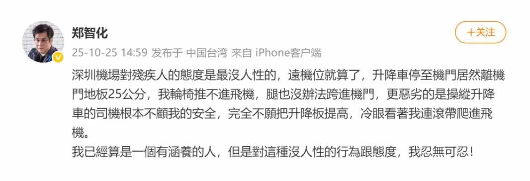 郑智化该不该道歉? 郑智化因机场的升降设备操作导致他坐轮椅上飞机困难在发文吐槽的时候就因为用了“连滚带爬”这个词语引起了舆论风暴,如今在视频监控公开后,网友发现郑智化并没有“连滚带爬”,所以风评立转,各种各样的的评论和言论铺天盖地的指向郑智化,也使郑智化不得不不在27日对自己的言论不当做出了道歉。 作为消费者,不管是正常人还是残疾人都有权利对为自己服务的机构、企业和个人提出意见和评价,所以郑智化对深圳机场的服务吐槽和评价是无可厚非的。难道就因为郑智化是残疾人,在吐槽的时候遣词造句中用了“连滚带爬”的形容词就应该受到网暴和质疑了吗? 中国文化博大精深,遣词造句更是变化万般,为了对表示的事和物,我们在经常会让事和物的表象显得更形象更生动都会加上形容词,那么郑智化在吐槽的时候使用“连滚带爬”这个词是不是就应该是夸大事实、有“诽谤”的嫌疑呢?还是真的要郑智化连滚带爬了才行? 深圳机场在郑智化吐槽后也迅速的做出回应并道歉,也对升降机的事做出了解释。 而对于郑智化因为使用“连滚带爬”不当的遣词引起的舆论风暴郑智化也作出了道歉,在道歉书发布后,也有很多人认为,郑智化可以说明情况但不需要道歉,但更多的人认为知错就要改,有错就必须道歉。 那么大家认为郑智化该不该道歉呢?