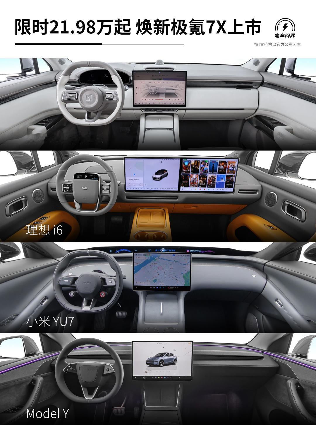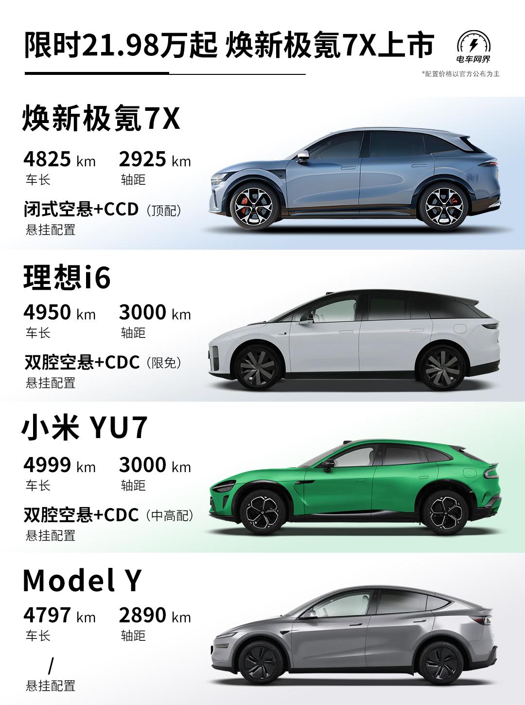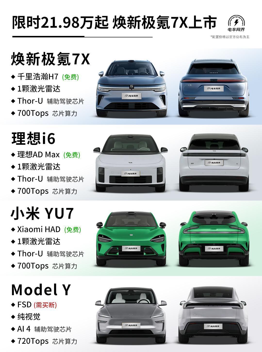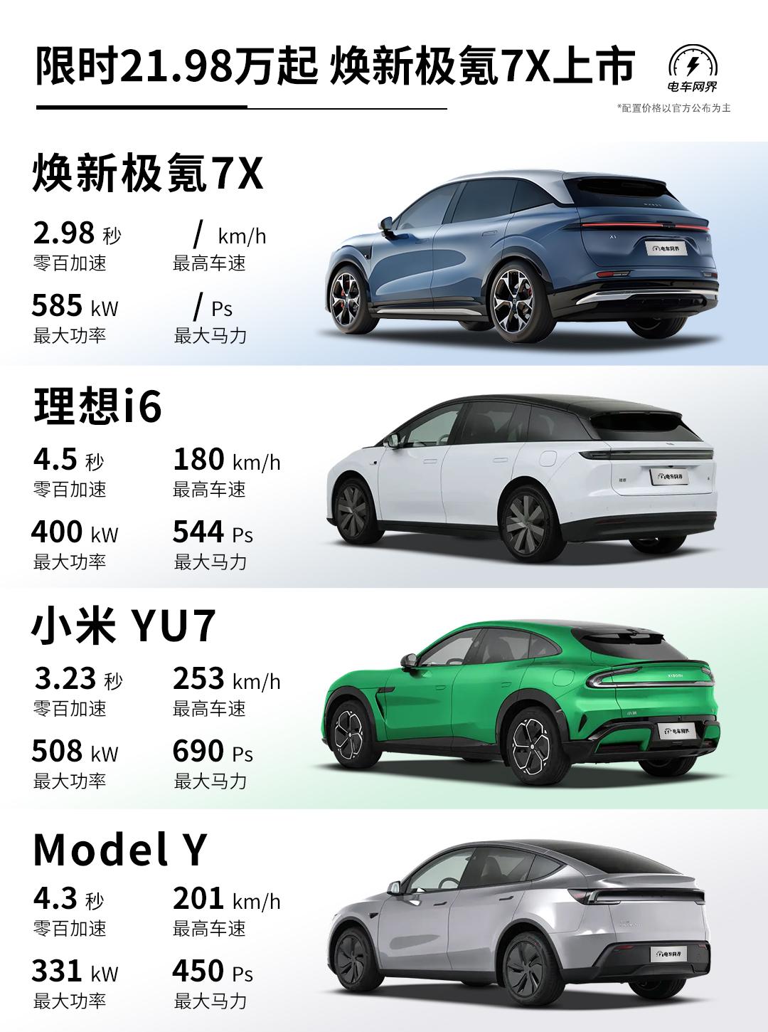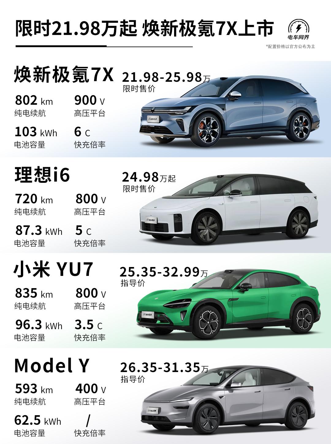 焕新极氪7X上市,叠加1万元置换权益后,限时价21.98-25.98万元(现款指导价22.99-26.99万元)。 作为改款车型,全系标配:900V高压架构、四门双层夹胶玻璃、麂皮绒顶棚、前排座椅加热/通风/按摩/记忆、主驾安全破窗器、激光雷达+Thor-U 700Tops芯片、辅助驾驶小蓝灯、8295座舱芯片、16英寸中控屏+AR-HUD、21扬声器音响系统... 续航上,103度后驱版纯电续航高达802km(老款780km)。 动力上,四驱Ultra版拥有585kW最大功率(老款475km),零百加速2.98秒(老款3.8秒)。 同级主要竞品车型有理想i6、小米YU7以及Model Y等,结合焕新极氪7X的价格来看,你觉得它的竞争力如何?【来自懂车帝车友圈】