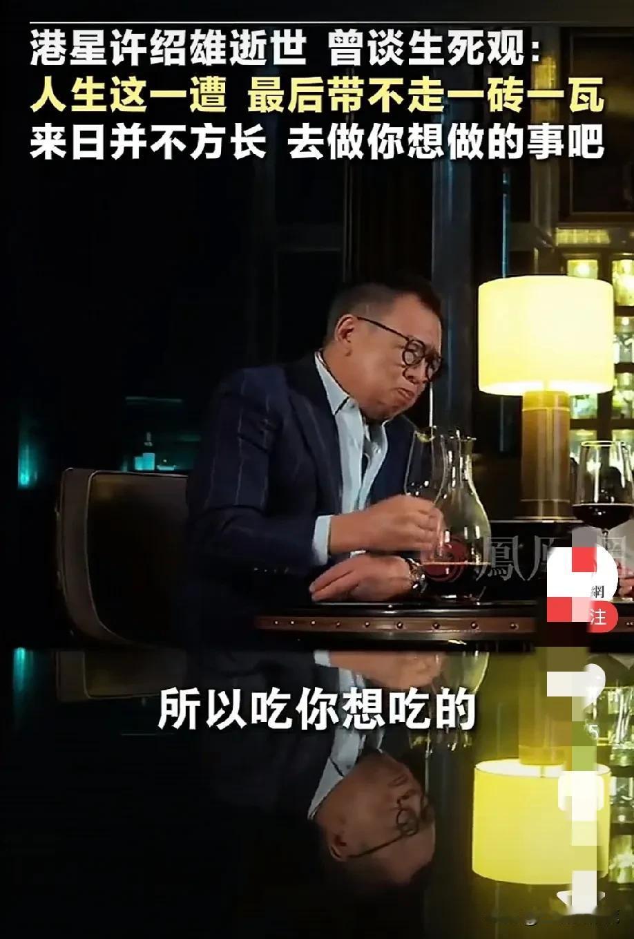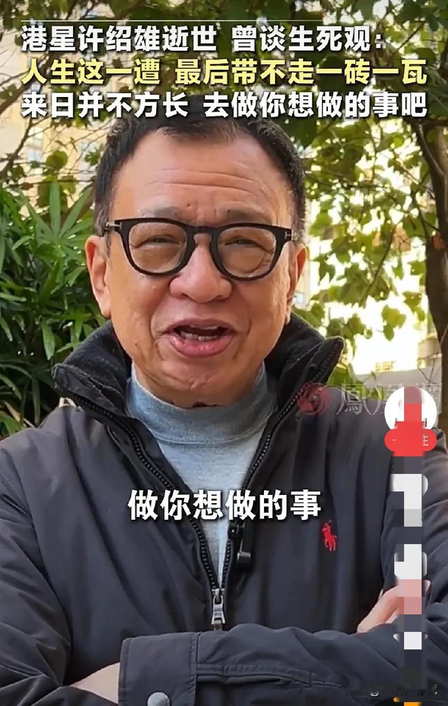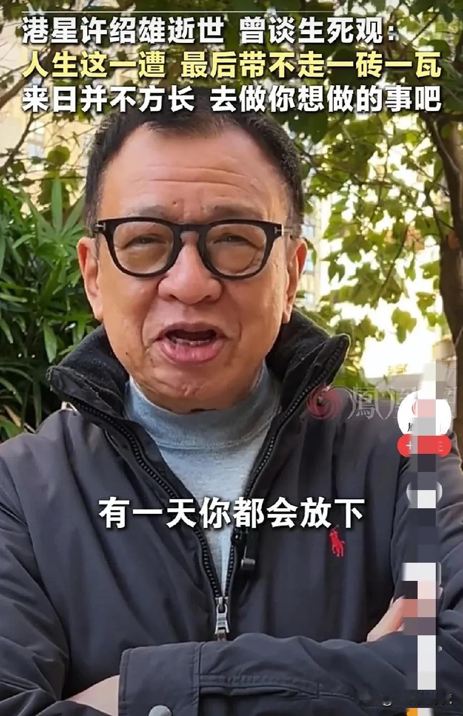 下午几个朋友聚会,聊到许绍雄去世。 一个朋友很黯然。 她说,感觉日子过得很没意思,这些年,她和老公努力赚钱,侍奉老人,养育孩子,不光没时间享受生活,还被鸡零狗碎的日子磨得暴躁易怒,两口子七天一大吵,三天一小吵,现在人到中年,身体也不好了,老公前段时间还做了个小手术,日子更难过了。 她叹口气说,生活,生活,生下来就必须要活下去,然后有一天突然就闭眼走了,这个过程有啥意义呢? 我们几个都沉默了。 是呀,人到中年,谁的生活不是一地鸡毛呢? 可是,我们终究还得过下去呀。 于是,我找到许绍雄先生之前的一段采访给她看。 许绍雄在采访里说:我们最后都要尘归尘,土归土,带不走一砖一瓦,所以吃你想吃的东西,去你想去的地方,见你想见的人,有钱把日子过好,没钱把心情调好。 我朋友看完。低头沉默了好久,再抬起头,她居然泪流满面。 她擦擦眼泪说,我可能真的忘了为什么活着了,我总在急急忙忙赶路,却忘了看路上的风景。许先生这话说的好,日子是难,但我自己不能让再在伤口上撒盐了,我得走出来。 看着她的样子,我有点欣慰。希望她以后,不要再忙着对付生活,而要和老公孩子一起享受生活,旅旅游,吃点好吃的,真到了以后的那一天,钱财带不走,但快乐和笑声都能留下。 生活,也许还是那一地鸡毛,但鸡毛里,也能找出点光。 愿我们都能找到那束光。[心]