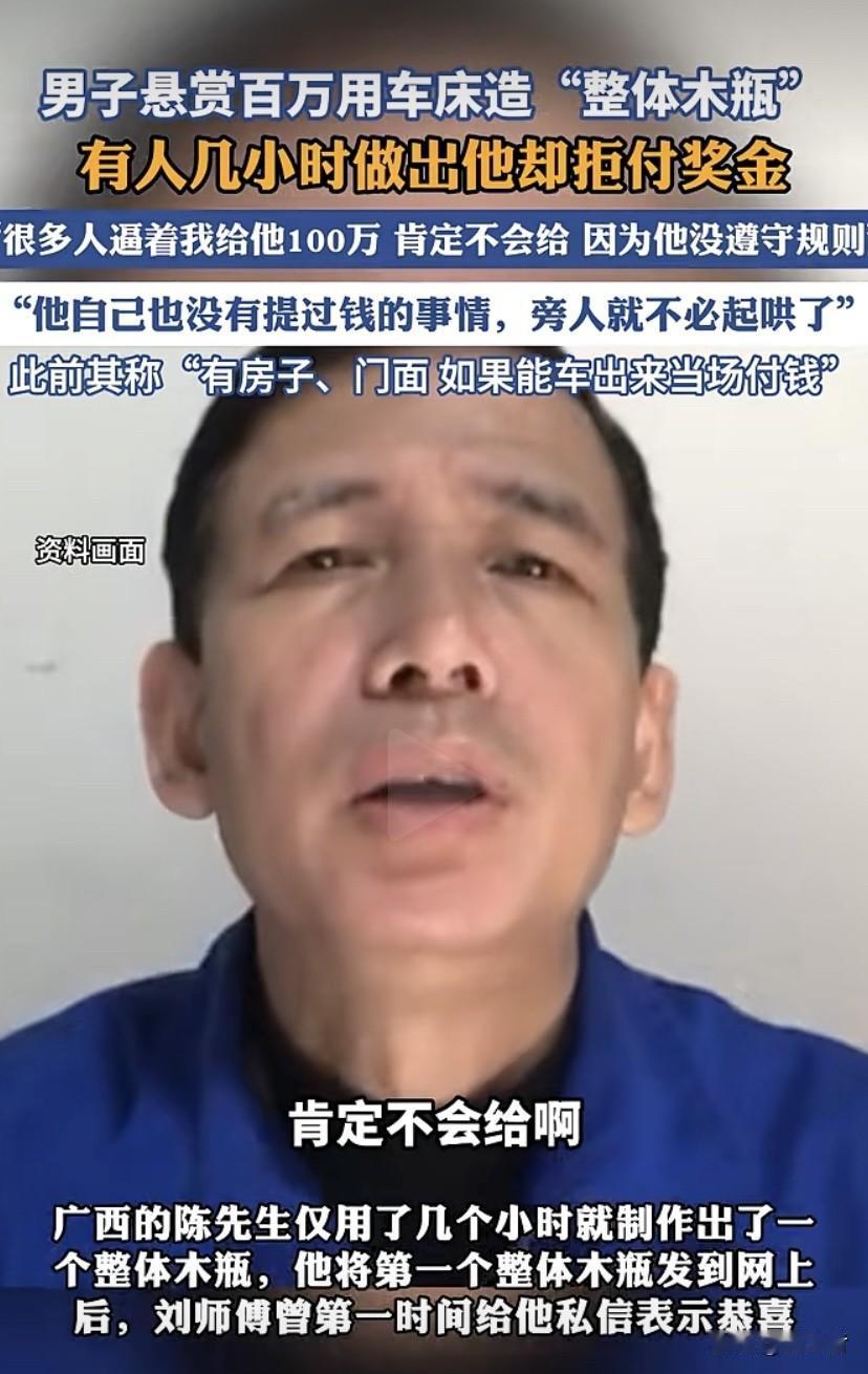 悬赏百万,他说这整体木瓶是自己花3年、成本百万才发明出来的。 悬赏发布后,广西陈先生仅用几小时就做出了整体木瓶。可刘师傅却拒付奖金,还称很多人逼他给钱肯定不会给,因为对方没遵守规则。有人觉得陈先生没经过完整干燥处理,快工做出的只是样品,半年后必裂,不算正品。刘师傅赌的就是没人愿意花一年时间慢慢雕琢。这奖金给不给,还真是一场罗生门啊。