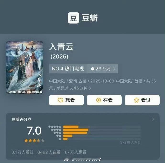 侯明昊卢昱晓《入青云》豆瓣开分7分