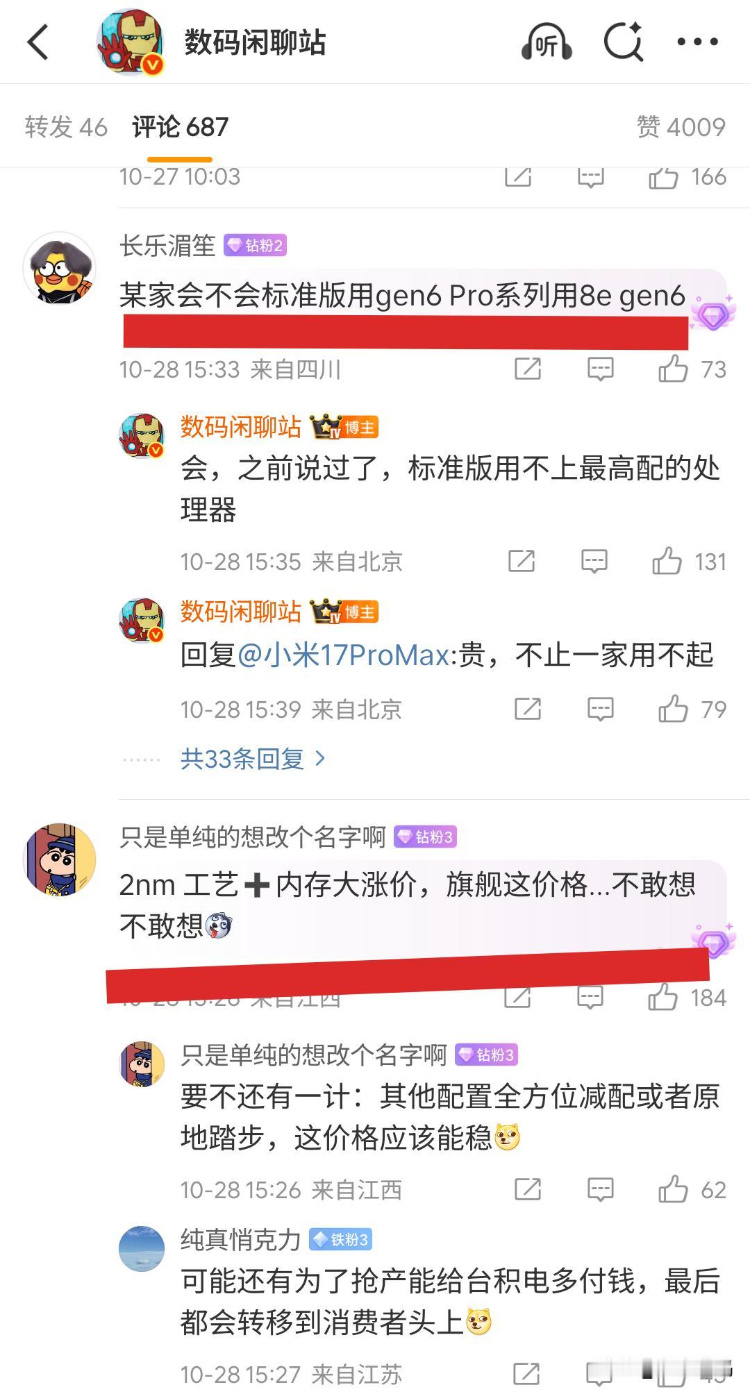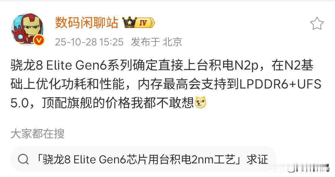 完了完了,明年手机又要涨价了,甚至还要减配! 前两天雷军和卢伟冰都说最近内存涨价太厉害了,所以我们可以看到今年发布的很多手机都有一定幅度涨价,没涨价的多多少少都有缩减一些配置。 这还没完,随着明年骁龙8Gen6 Elite切入到2纳米工艺(Gen6 Elite直接上N2p工艺)。成本又直线上升,上升到很多标准版都不会用骁龙8Elite Gen6,转而使用低一级的骁龙8Gen6,这种定位有点像苹果的规划。 除了芯片涨价,内存常规涨价外,内存明年也要升级,LPDDR6和UFS5.0肯定从成本上会比现在的LPDDR5X.和UFS4.1贵,这样一算下来,明年标准版4599怕不一定打的住。如果想维持这个售价,那就只能砍屏幕,砍影像。。。。 有点没想通,为啥苹果就没那么大成本压力?人家起售价一直没涨,但是内存,芯片,屏幕这些该升级还是升级。 国内厂家就不能联合起来,向高通施压?或者大家一起拼个单,整个团购价???
