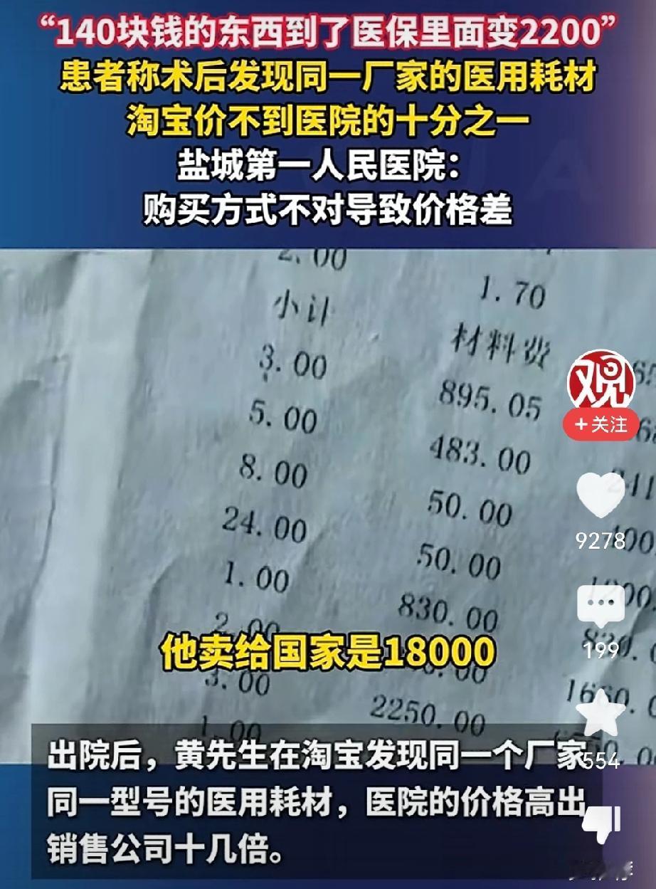 同样的医用器具,网上卖140,从医保里面卖2200。黄先生在网上筹齐一套花了1800,可是从医保里买需要18000。扩大了10倍!黄先生仔细核对了厂家,合格证,发现一模一样! 于是,及时向医院反映情况!医院回复是,黄先生与医保购买途径不同,导致差价巨大!差了10倍! 网友评论:医疗领域的水还是有些深啊!按道理,医保采集量大,应该越来越便宜!可现实与道理正好相反! 不做过多分析。大家静等进一步消息吧!医保内药品价格