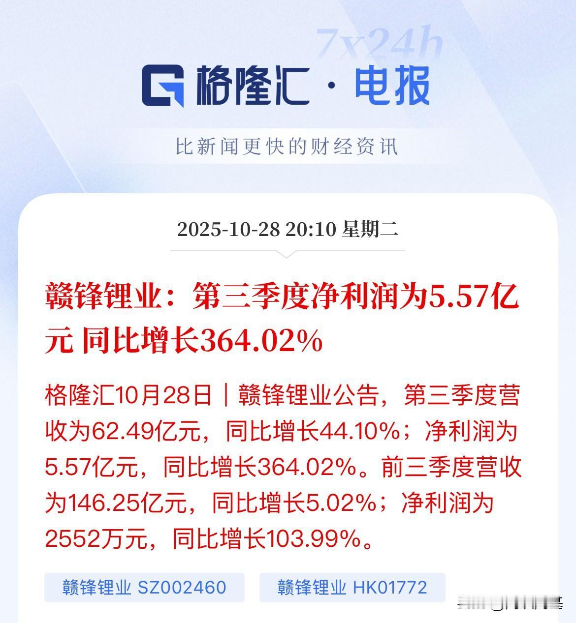 寒冬已过,探底回升了,新能源电池集体回暖,赣锋锂业三季报净利润大涨364% 固态电池利好不断,锂矿价格持续走稳,新能源板块迎来了基本面反转, 赣锋锂业从腰斩到扭亏为盈了,三季度营收同比增长44%,净利润同比直接翻三倍多, 2025年三季度以来营收涨幅5%,利润为2000多万了,起码不是亏了, 随着固态电池的应用加快,锂矿的价格持续回稳,行业“反内卷”的持续,新能源电池或真迎来反转。