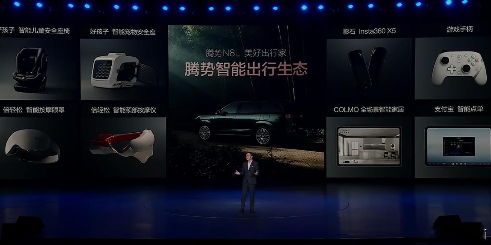 越级价值终极满足!腾势N8L还支持6大智能场景模式,智能出行生态与好孩子,倍轻松,COLMO,影石相机,支付宝等合作