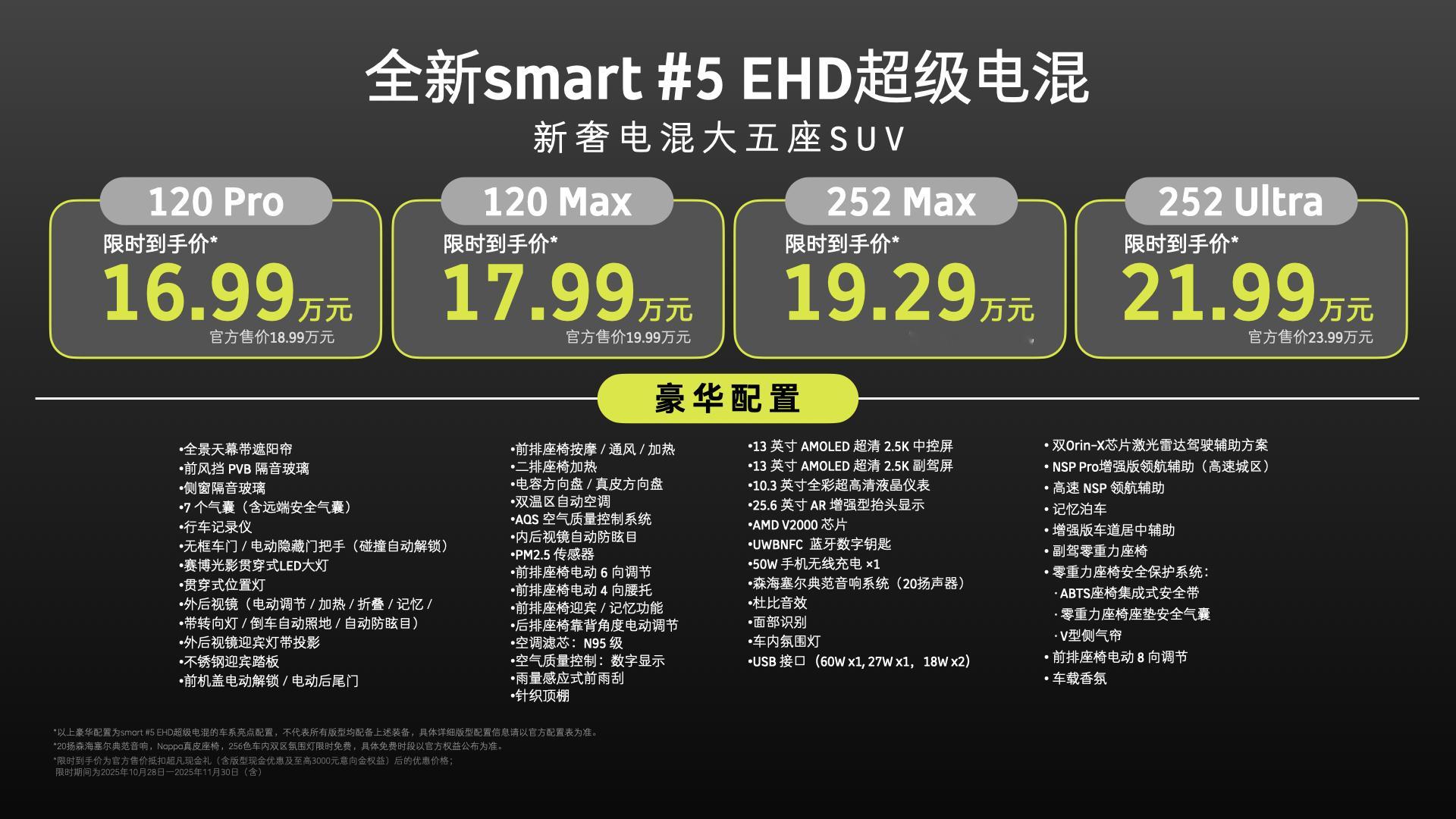 20万内豪华插混唯一选择在插混SUV越来越卷的当下,能在20万内同时满足豪华,节能,续航,恐怕只有smart 精灵5号 EHD超级电混,限时到手价16.99万元起!