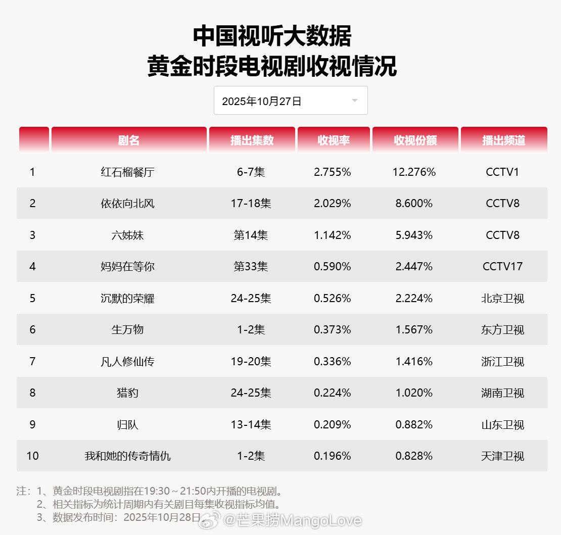 【2025年10月27日中国视听大数据CVB黄金档电视剧收视率日榜TOP10】