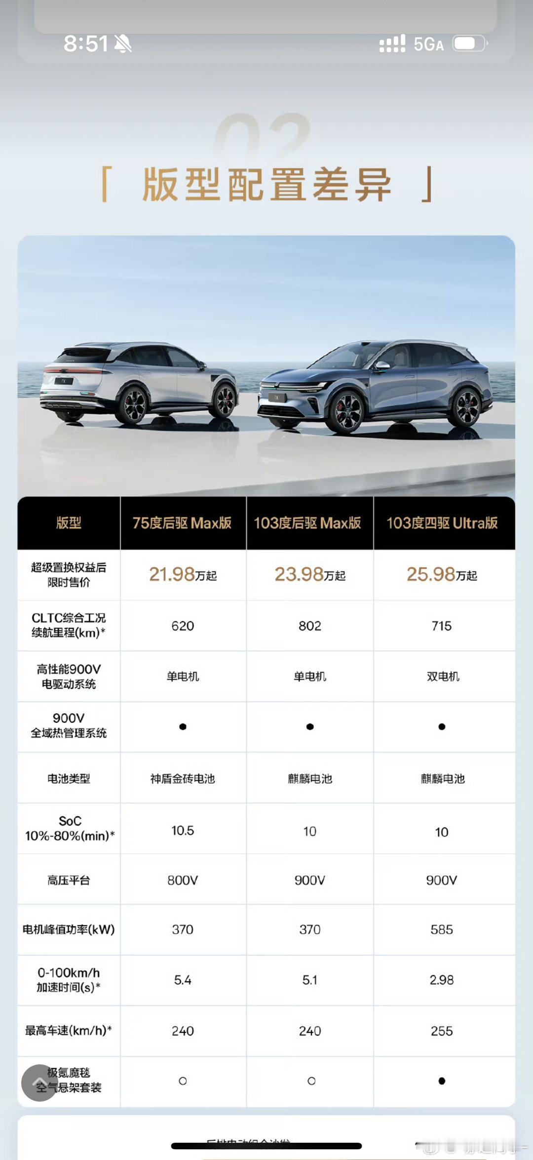新车全面升级900V高压架构,充电效率大幅提升,10分钟可从10%电量充至80%,续航最长可达802km(CLTC)。四驱版性能强悍,峰值功率585kW,零百加速仅2.98秒,搭配极氪魔毯空气悬架与CCD电磁减振