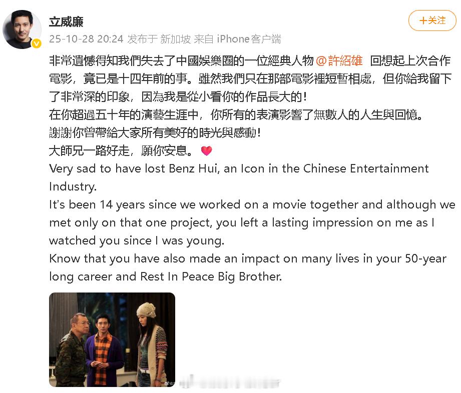 立威廉悼念许绍雄 立威廉悼念许绍雄:“在你超過五十年的演藝生涯中,你所有的表演影響了無數人的人生與回憶。謝謝你曾帶給大家所有美好的時光與感動!大師兄一路好走,願你安息。❤️”
