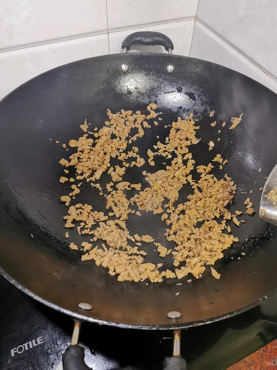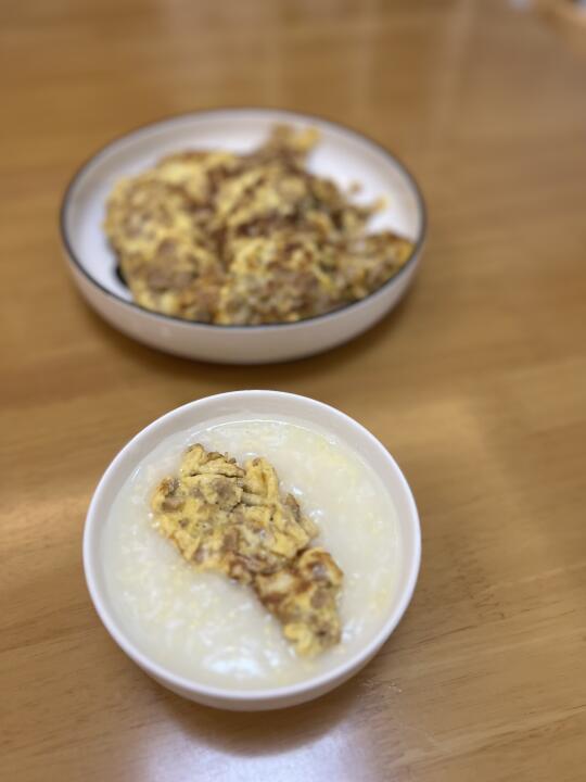 吃了十几天白切鸡了,今天终于不用吃白切鸡了,还是喝点清粥小菜最合胃口。 妈妈说今晚吃点清谈的,我提议吃点白粥和萝卜干炒鸡蛋。 明火白粥最舒服,锅里加入清水、花生油、少许盐水开后放入米跟小米,一定要不断搅拌,防止粘锅,煮到白粥变浓稠就可以关火。 萝卜干用清水浸泡十来分钟,挤干水份切碎备用。 重新起锅热油,把萝卜干炒干炒香装盘。 打入几个鸡蛋,再加入少许玉米淀粉水,搅拌均匀。把鸡蛋放入锅里,煎至两面焦黄即可出锅。