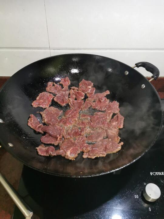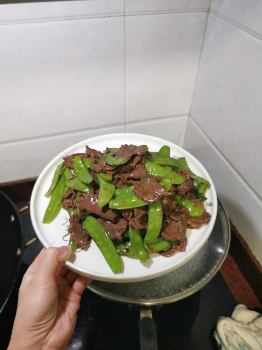 重新起锅,把锅烧到冒烟倒油,把牛肉放入锅里,摊开,煎至底部变色,翻面,煎至变色,加入荷兰豆,翻炒均匀即可出锅。