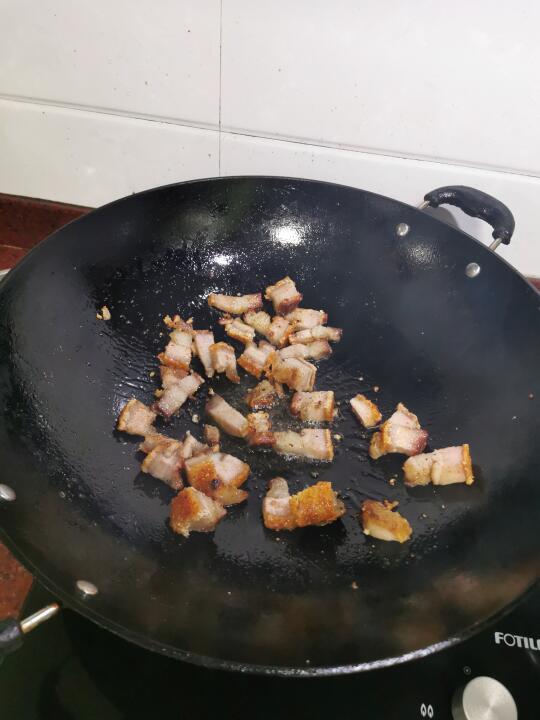 重新起锅热油,把烧肉放入锅里炒香,加入蒜心,翻炒均匀,加入少许蚝油,翻炒均匀即可出锅。