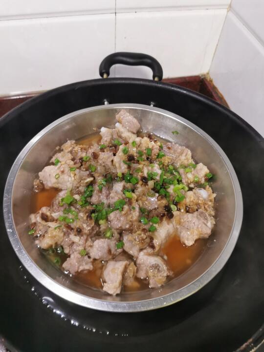 排骨用清水浸泡半小时,用清水洗净控干水份,把排骨放入碗里,加入少许盐、蚝油、玉米淀粉、炒香的蒜蓉、红葱头、豆豉抓拌均匀腌制十分钟,水开后上锅蒸12分钟即可。