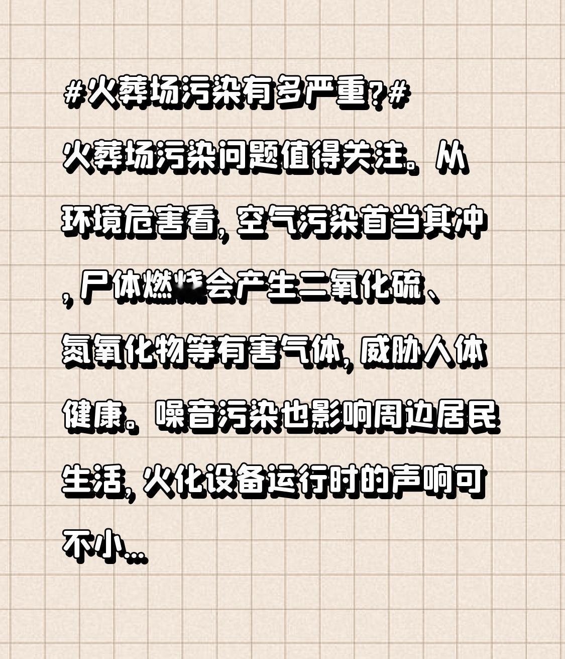 火葬场污染有多严重? 火葬场污染问题值得关注。从环境危害看,空气污染首当其冲,尸体燃烧会产生二氧化硫、氮氧化物等有害气体,威胁人体健康。噪音污染也影响周边居民生活,火化设备运行时的声响可不小。 水资源污染也不容忽视,废气中的重金属等有害物质若处理不当,会污染周边水源。而且火葬后的骨灰及其他固体废物处理不当也会造成污染。 不过,也不能完全否定火葬。随着人口增长土地紧张,它能节约土地资源。我国火葬率从1956年不足5%到2023年超50%。为减轻污染,可提高环保标准、优化布局、加强监管。