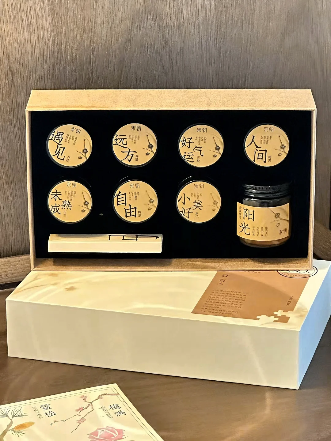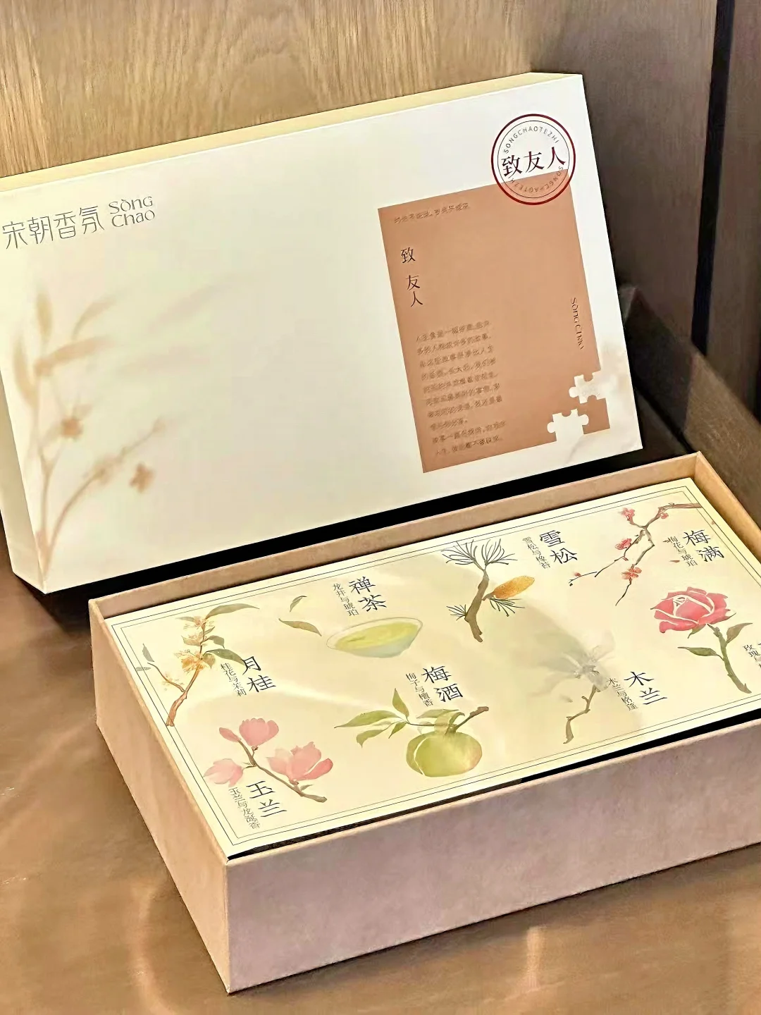 送我的好朋友也太nice了! 宋朝香薰致友人礼盒真的好好看 从包装到蜡烛都把东方美学发挥得淋漓尽致😍 打开就是8种不同香味的香薰蜡烛 1大7小每个都敲好闻的! 而且每款蜡烛背后都配有一段暖心寄语 真嘟能感受到满满的心意💕 🥀玫瑰檀香 清冷的玫瑰香🥀带着檀香的寺庙感,好高级的味道~ 🍵西湖龙井 香醇的龙井夹杂着一丝茉莉花香🌸茶香味很沁鼻 🌧满陇桂雨 仿佛陷入一场香甜的桂花雨,整体的香味不腻人,淡淡的 很舒服~ 每天都能闻到不同的香味!! 别提多快乐了✌🏻