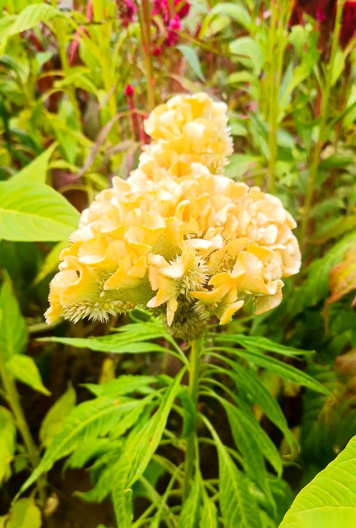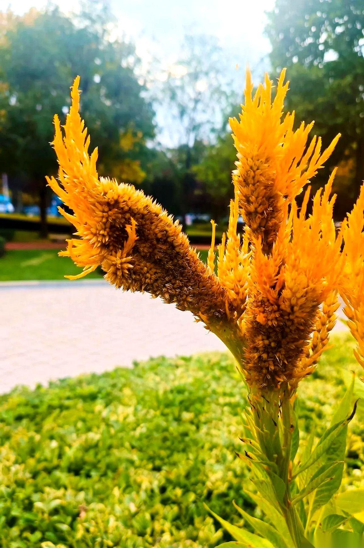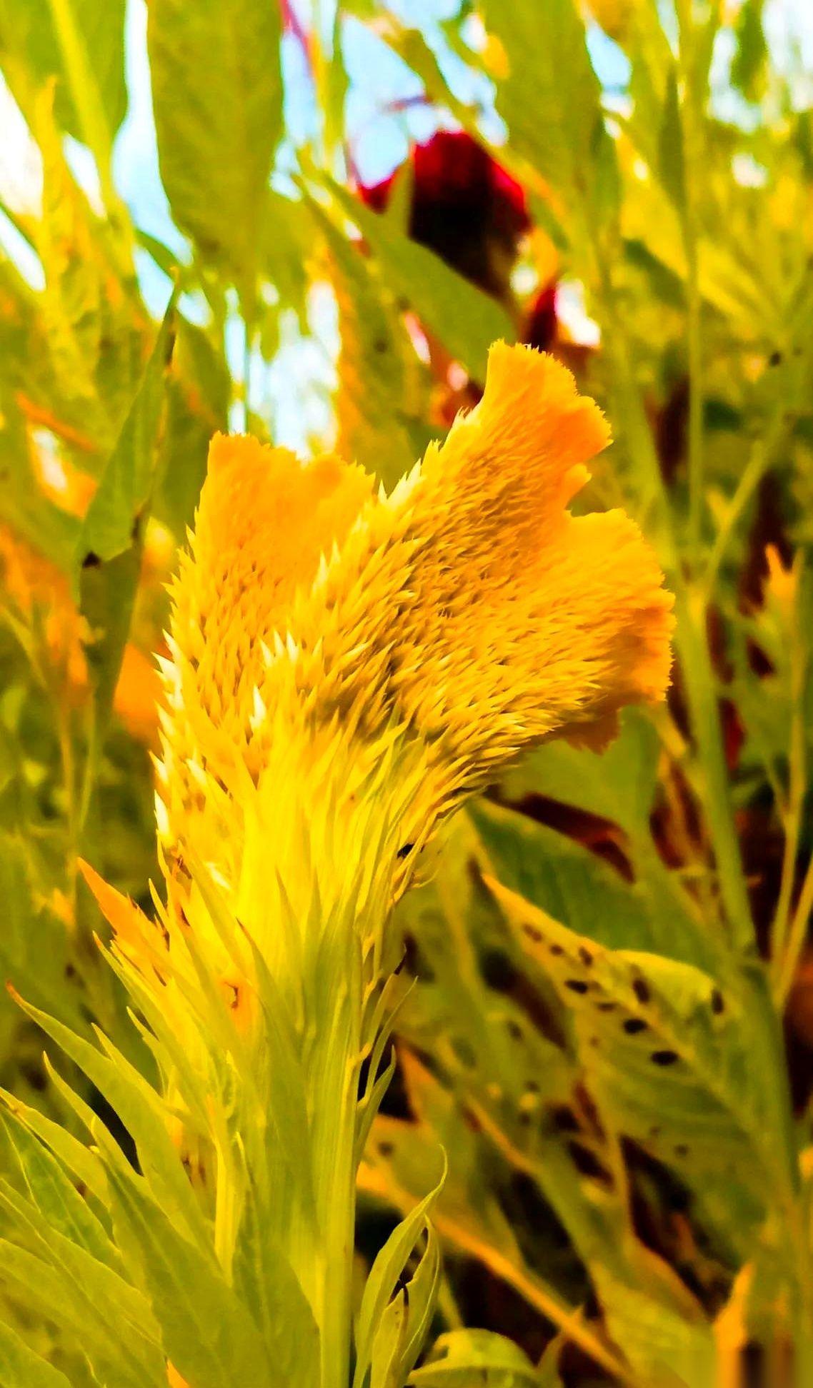 我跟你讲,第一眼看见这玩意儿,我以为谁家的大公鸡把冠子掉地上了。 凑近了一看,好家伙,是花。 叫黄鸡冠花。这名字也太实在了点吧。 它就那么一丛一丛地杵在那儿,黄得那么不讲道理,黄得那么理直气壮,旁边所有的花花草草瞬间就没了颜色。 感觉整个秋天的明亮,都被它一个人承包了。 你以为它就是个样子货?不是。 它的花瓣,都不是花瓣,是那种厚实的、天鹅绒一样的质地,毛茸茸的,让你忍不住想伸手去摸一把。它不是那种柔弱的美,它是一种生命力爆棚的、有点“野”的美。 秋天嘛,在大家印象里总是带点萧瑟,带点“枯藤老树昏鸦”。 可这鸡冠花偏不。 它就像秋天里的一个“显眼包”,一个最有反骨精神的家伙。 管他秋天是不是要伤感,管他别的叶子是不是都黄了,老子就要开得热热闹闹,就要用最扎眼的颜色,告诉全世界我来过。 有时候觉得,做人也该这样。 在自己的人生季节里,别管别人怎么看,活出自己的颜色,活得热气腾腾。 秋天给的一份惊喜,收下了。