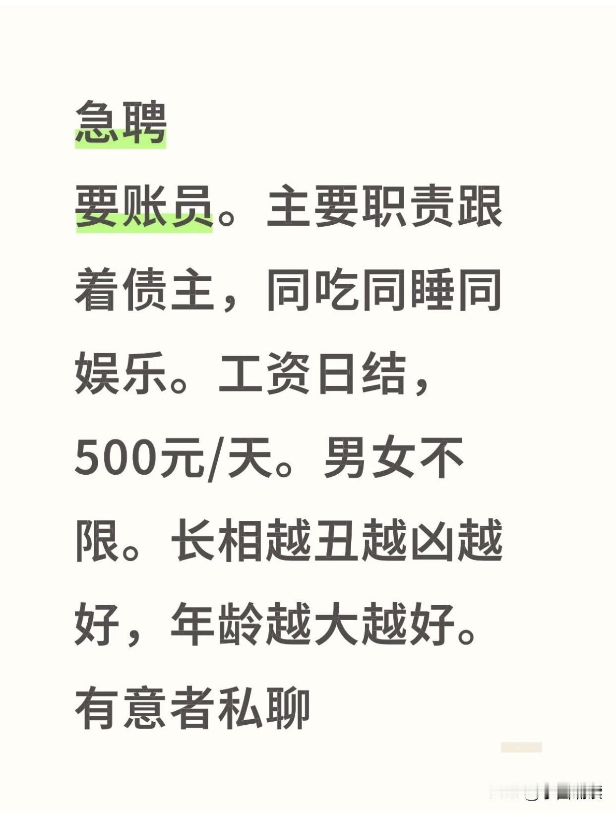 哈哈,看了这则招聘广告,我的心里就像坐了一次高空过山车,翻江倒海、一涛三折! 一开始被这工资待遇强烈吸引,工作职责是吃喝玩乐,工资日薪500,月薪15000,一个字形容“爽”。 转念一想,细思极恐。每天的工作是跟着债主同吃同住同娱乐,这种行为合法吗?万一被人拒之门外或者被人拿着棍子赶岀来怎么办? 最重要的是,招聘信息所说长的越丑越凶、年龄越大越好,我对着镜子看了好几遍,没有一条符合要求。 思考再三,我还是做出一个艰难的决定:撤!