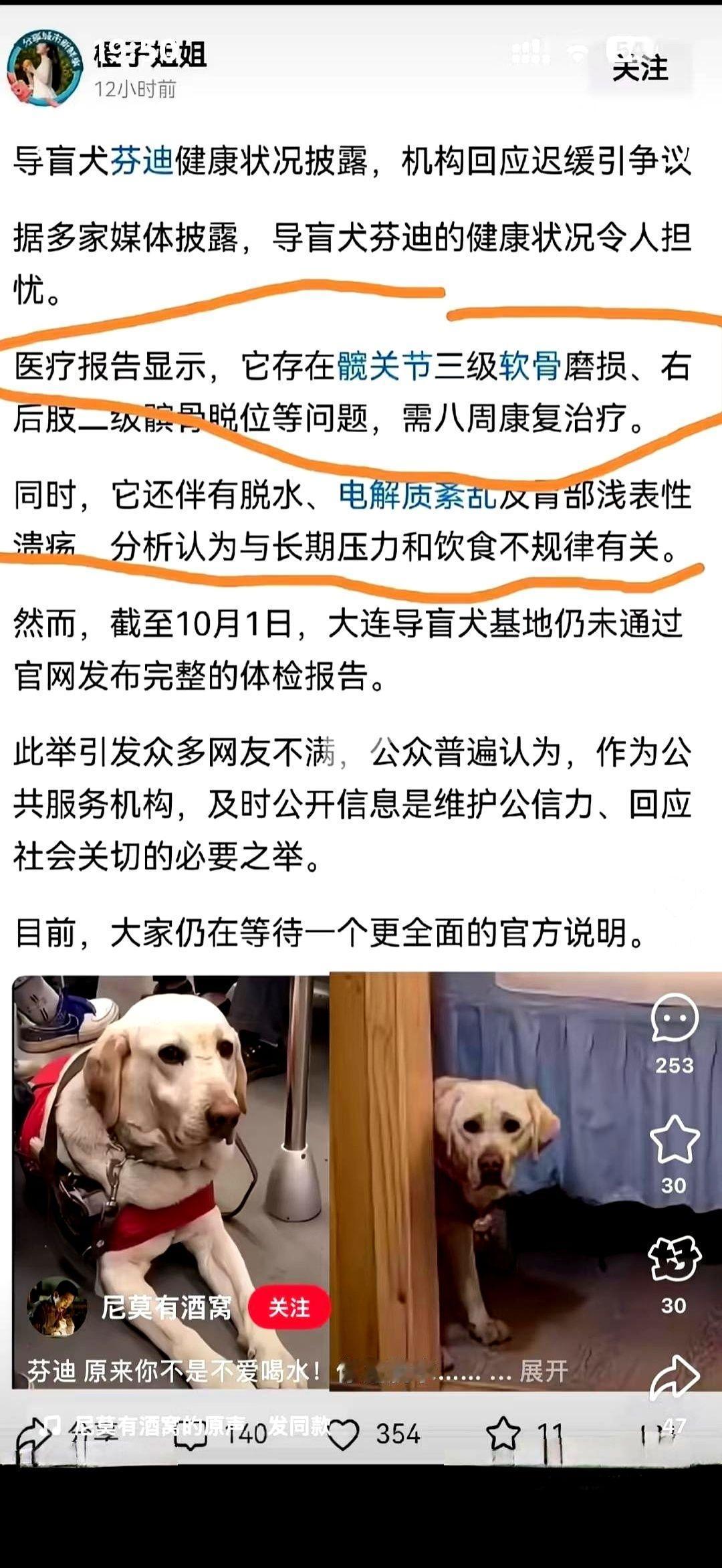 右腿磨损,脚掌严重磨损,肌肉拉伤,体重掉了快五斤。 这不是什么战损报告,这是一条叫芬迪的导盲犬,被找到之后,拿到的体检单。 然后,据说还要把它送回去。 我真的,一下子就破防了。 你知道最让人难受的是什么吗? 是狗不会说话。是它就算被磨成这样,它回去见到主人,还是会摇尾巴。是它的世界里,可能根本没有“值不值得”这个选项,只有“忠诚”这一个出厂设置。 它不是一个冰冷的导航仪,用坏了送去维修一下,然后拿回来继续用。 它是一条命啊。 它是在用自己的健康,甚至生命,在给一个人当眼睛。 现在,这双“眼睛”磨损了,以后上下楼梯都得小心翼翼了。一条专业的导盲犬,职业生涯可能就这么被打了折扣。 我不知道该说什么。 只希望那句“大概率还是会回到王女士身边”,后面能跟着一句“她发誓会比从前珍惜一百倍”。 拜托了。