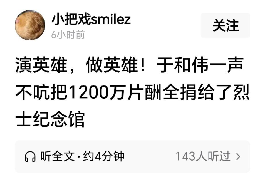 演英雄,学英雄,做英雄!于和伟把饰演《沉默的荣耀》获得的片酬1200万,全部捐给了烈士纪念馆!这份沉甸甸的善意,打了谁的脸? 文艺宣传的目的是什么?缅怀先烈,学习先烈!歌颂善良,宣传励志,教人做人!获得幸福…… 再看看流量为王的当下,一些艺人、主播为了钱不择手段,直播间充斥着低俗、色情、欺诈……有些大荧屏也是光怪陆离…… 于和伟的善举,不应该一声不吭,而应进行广泛宣传,弘扬正气!大家觉得呢!