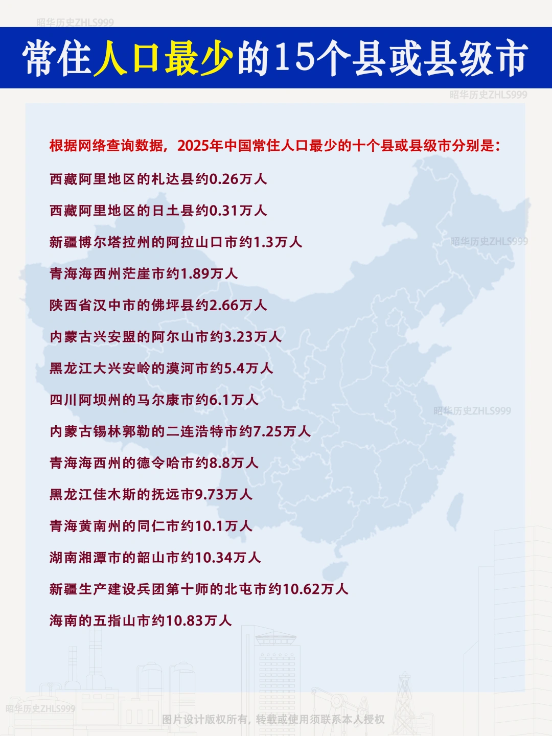 根据网络查询数据,2025年中国常住人口最少的十个县或县级市分别是: ⚪️西藏阿里地区的札达县约0.26万人 🔴西藏阿里地区的日土县约0.31万人 ⚪️新疆博尔塔拉州的阿拉山口市约1.3万人 🔴青海海西州茫崖市约1.89万人 ⚪️陕西省汉中市的佛坪县约2.66万人 🔴内蒙古兴安盟的阿尔山市约3.23万人 ⚪️黑龙江大兴安岭的漠河市约5.4万人 🔴四川阿坝州的马尔康市约6.1万人 ⚪️内蒙古锡林郭勒的二连浩特市约7.25万人 🔴青海海西州的德令哈市约8.8万人 ⚪️黑龙江佳木斯的抚远市9.73万人 🔴青海黄南州的同仁市约10.1万人 ⚪️湖南湘潭市的韶山市约10.34万人 🔴新疆生产建设兵团第十师的北屯市约10.62万人 ⚪️海南的五指山市约10.83万人