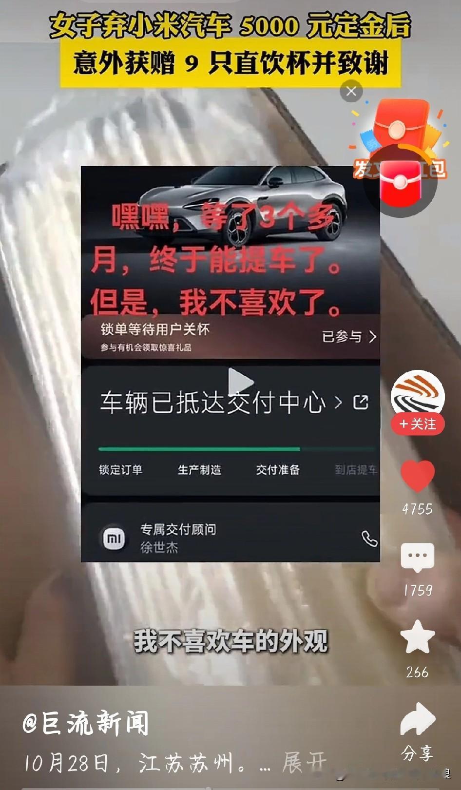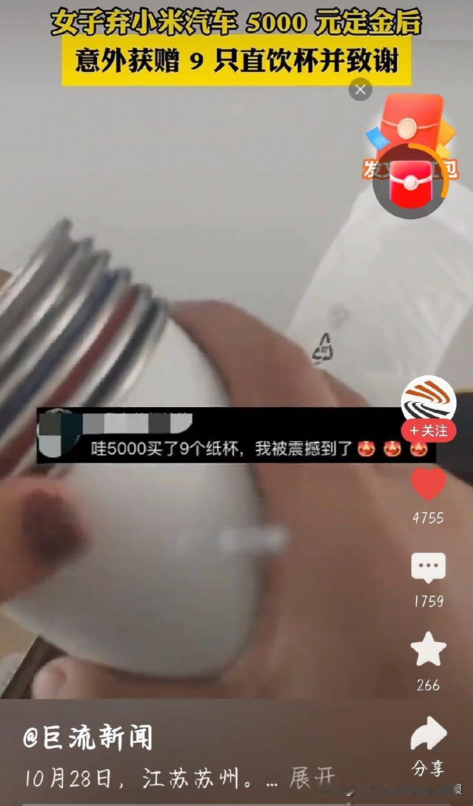 弃5千定金反而赚了?小米这波操作太圈粉 苏州有个大姐,订小米YU7汽车交了5千定金,后来嫌外观不好看,干脆放弃定金不买了。 本以为这5千块打了水漂,结果没几天收到小米寄来的快递,拆开一看是9只不锈钢直饮杯。这杯子可不是便宜货,之前小米商城29.9元俩都抢疯了,二手平台都炒到200块一个。 大姐自己都懵了,直说“这杯子质感真不赖”。要知道按规定,锁单后定金本就退不了,送赠品纯属额外的心意。 网友都夸这是“教科书级的用户关怀”。比起硬推销,这种买卖不成仁义在的做法,反而让人觉得实在。哪怕不成交,也把好感留下了,这波真的会处。小米汽车订单量 女子弃小米汽车5千定金后获赠直饮杯 小米YU7 小米汽车 图片截图于巨流新闻