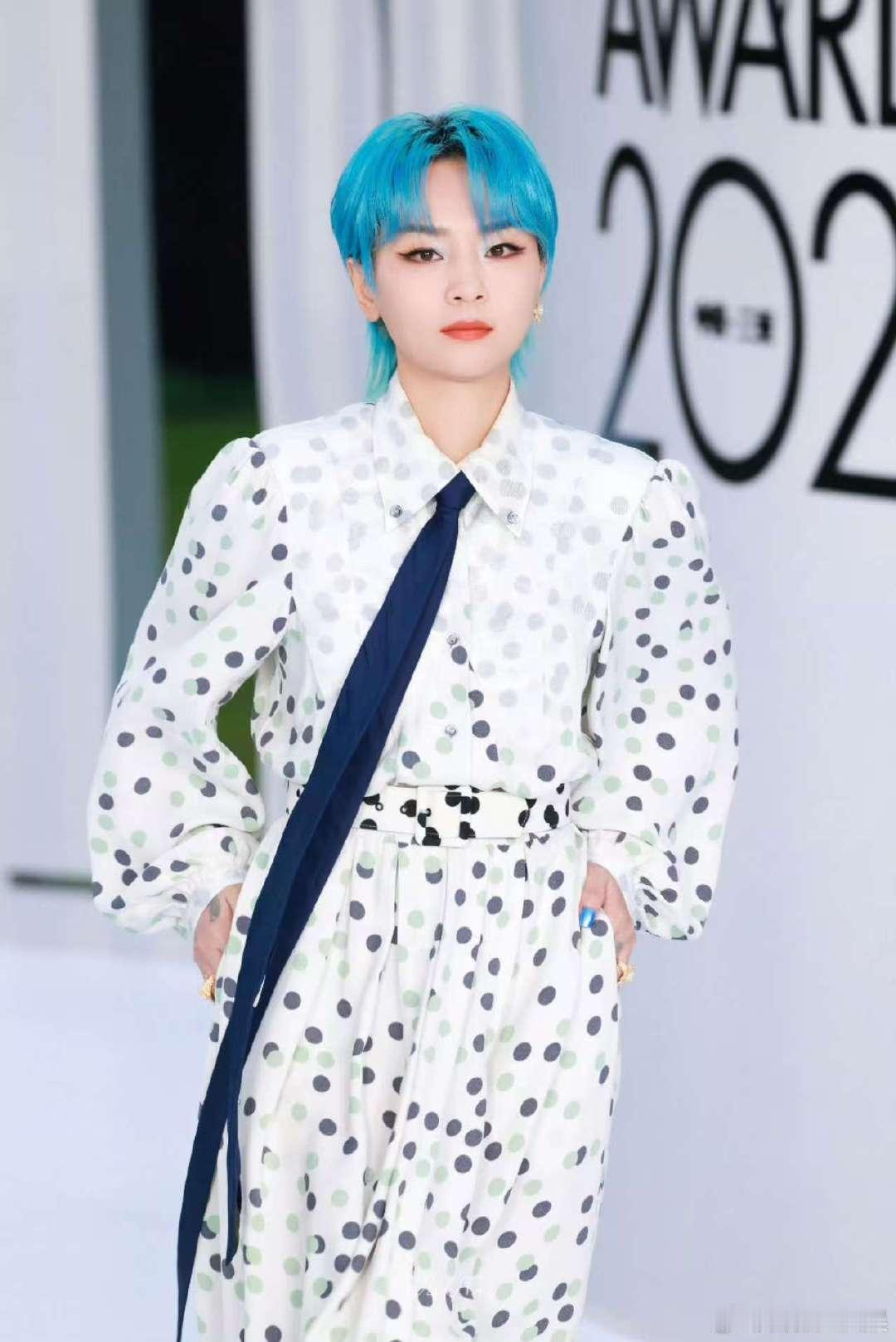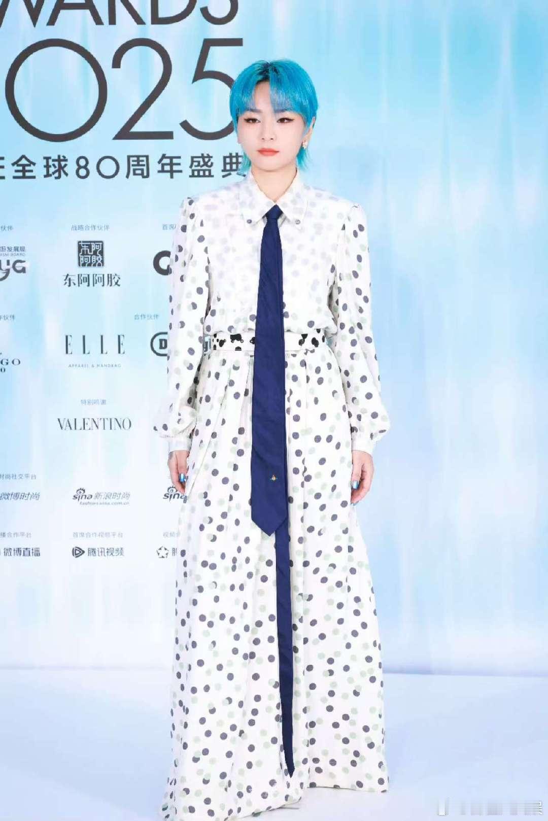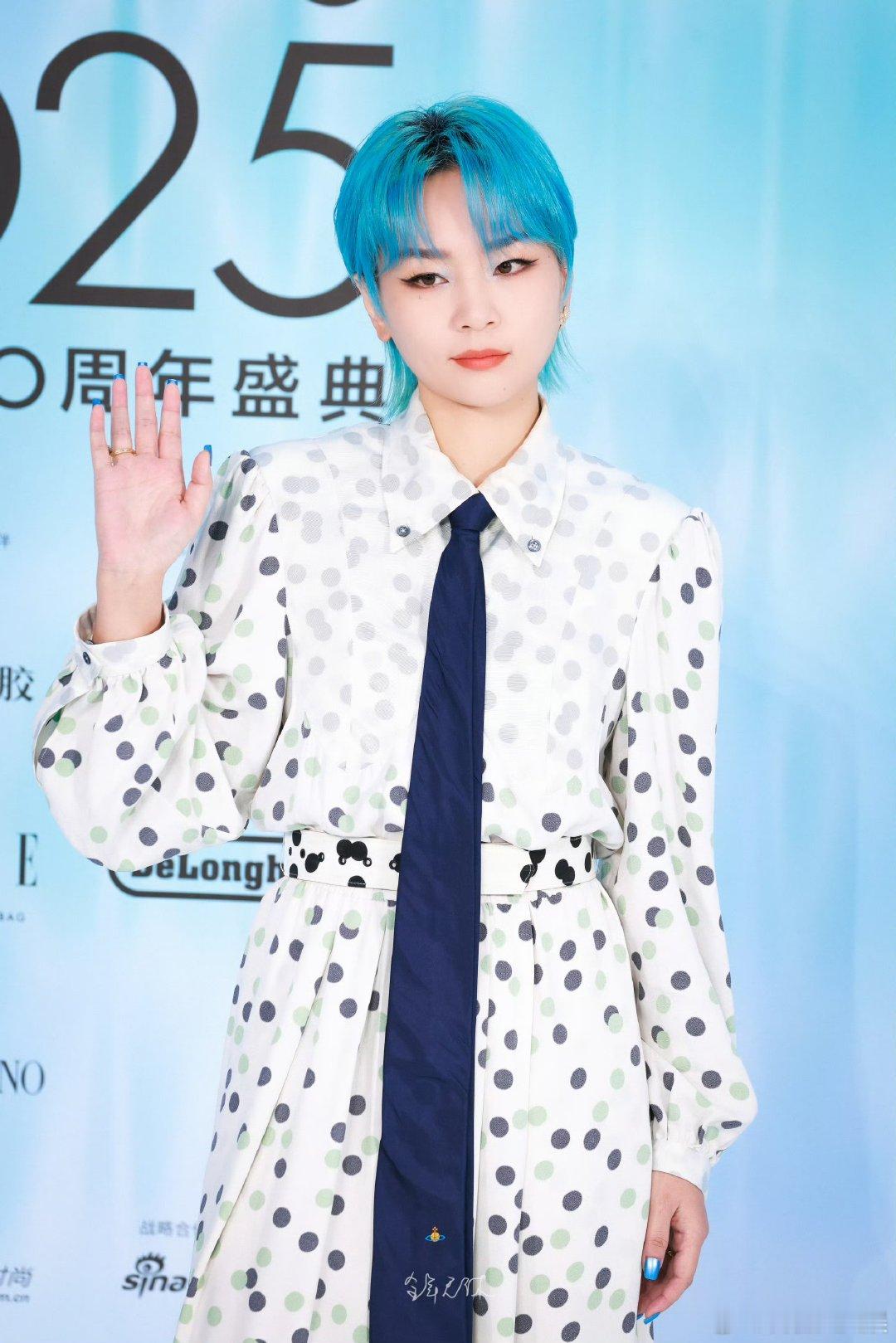 周笔畅ELLE红毯生图周笔畅ELLE红毯造型周笔畅ELLE红毯生图可!白波点裙搭深蓝长领带,蓝发很有特色,造型甜酷感拉满,每一张都像时尚大片,笔笔时尚感在线