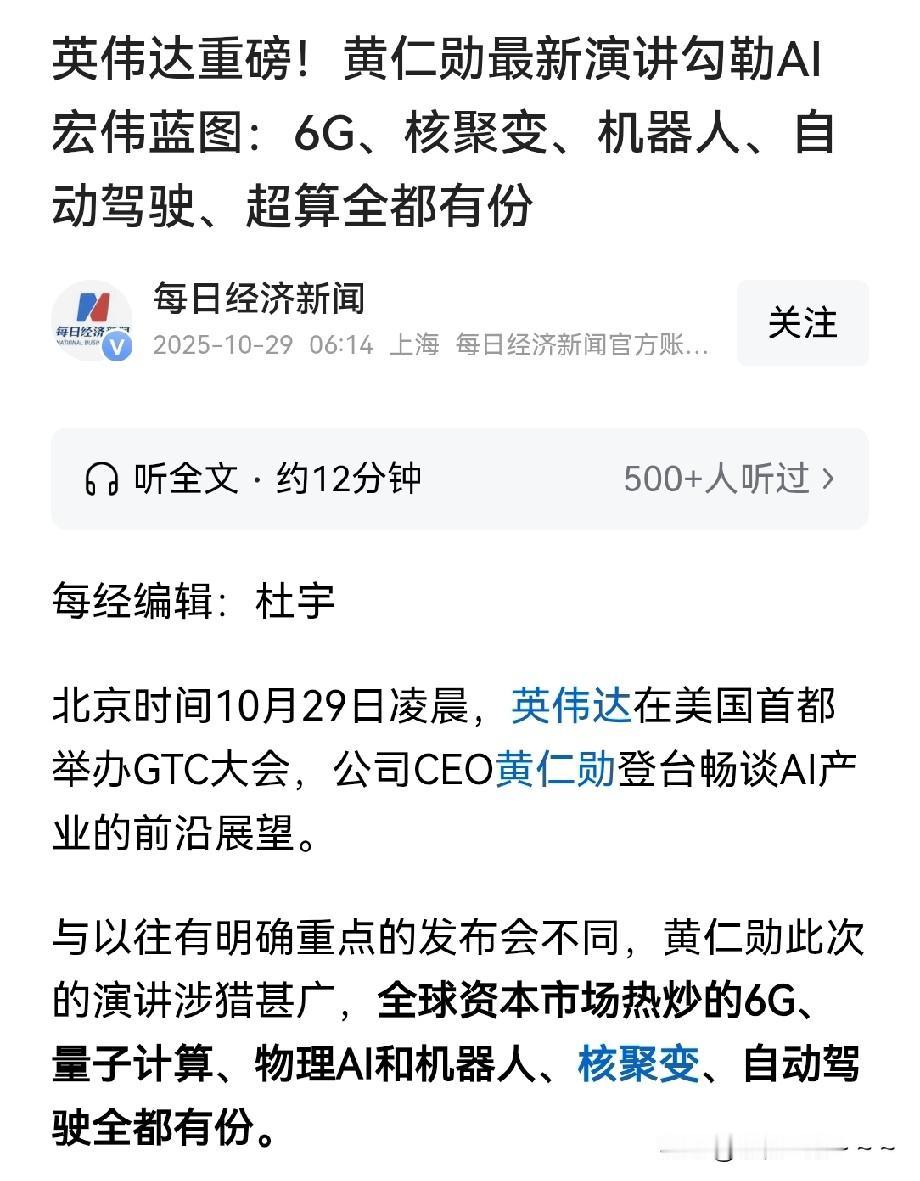 呵呵,[捂脸] 发现没,不是黄仁勋多么牛逼有预见性,而是,是他“涉嫌抄袭十五五”规划吧? 他昨天半夜勾画的宏伟蓝图,什么6g,核聚变,自动驾驶,机器人…对照我们的十五五规划里的第8小点,里面内容不都是一样吗?而且是昨天我们下午出台的规划,他昨天半夜才讲的。 所以,他肯定是认真仔细阅读了我们的十五五发展规划。然后立马抢先一步,再给美国人演讲,从而刺激了英伟达股票的大涨,从而带动了美股大涨。[捂脸]