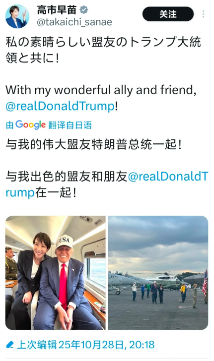 俗话说:男女有别!高市早苗难道不怕梅拉尼娅夫人吃醋吗?10月28日晚,日本首位女首相为了彰显与美总统的关系好,晒出两张合照,一张是在机场一张是在机舱,让人看着他们确实很“亲近”。 从晒出的照来看,高市早苗穿着一身深色职业装,然而美总统的手放在她后背上,这个动作让人看起来两人关系不简单,何况梅拉尼娅并不在场。 还有他们在飞机上拍合影,高市早苗坐在美总统后面,两人贴在一起笑容灿烂,不知道的还以为是一家人,殊不知他们不是父女不是祖孙,也不是夫妻。