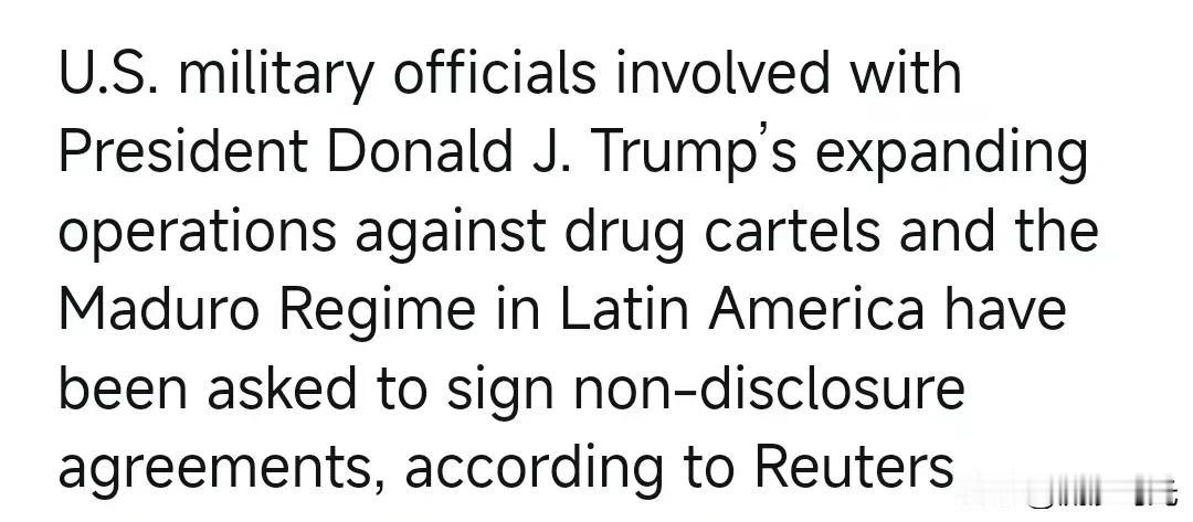 据路透社报道,参与特朗普总统针对拉丁美洲贩毒集团和马杜罗政权的扩大行动的美国军方官员已被要求签署保密协议。