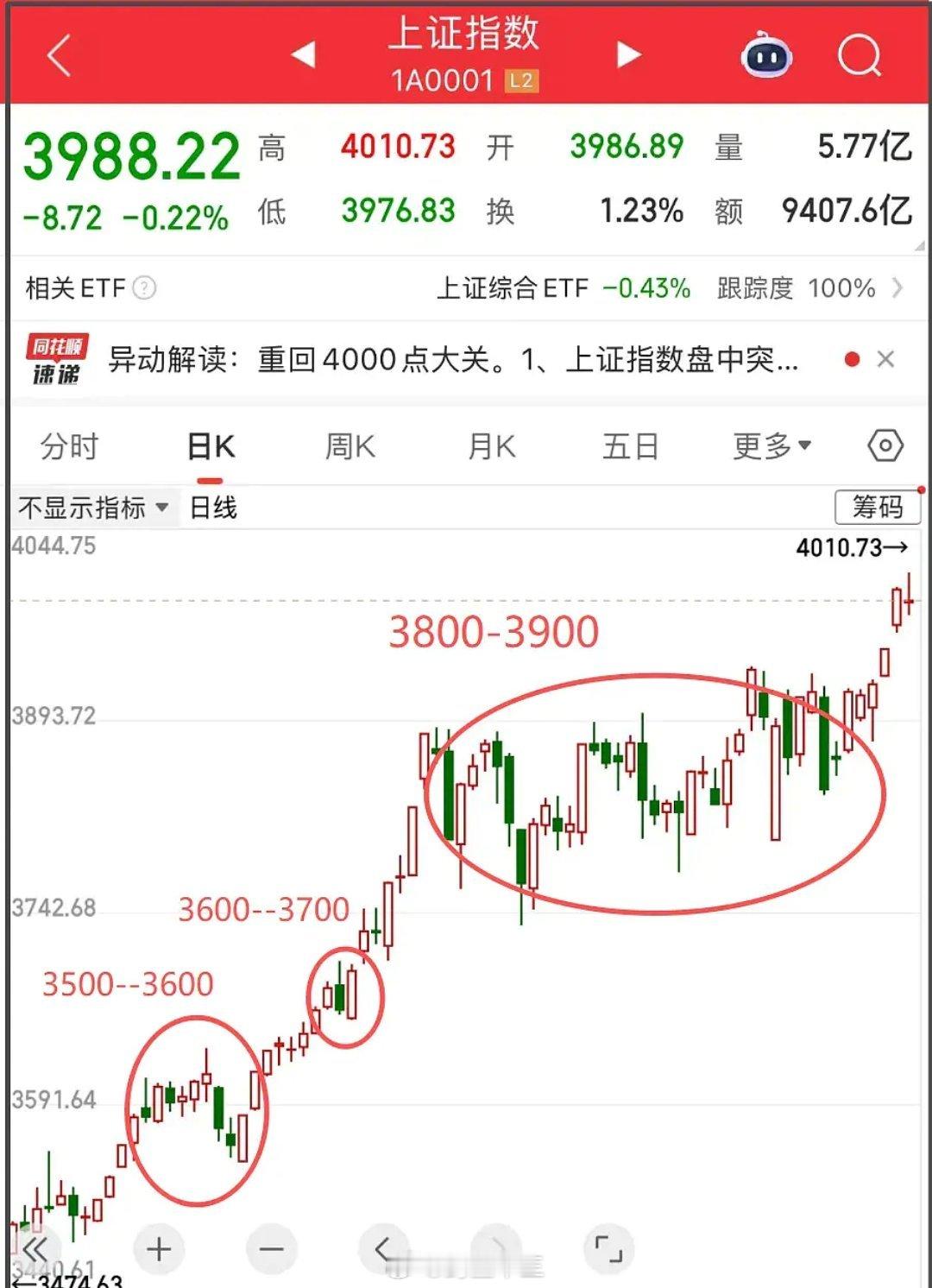 如图所示,每次突破整数关口的时候,如果你仓位不多,并且不在主线,这时候你要忍住,你还有大把机会上车: 3500到3600震荡了10天,3600到3700震荡3天,3700到3800是直接突破的,但3800到3900震荡了整整两个月。