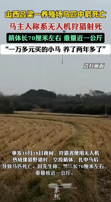 必须严惩!山西吕梁,一男子将马散养在养殖场内,第二天再去看时,却发现马儿没有了呼吸,身上还插着一把70厘米长、重2斤的金属弓箭!原来,当天晚上有人用无人机投放弓箭杀野猪,却把马当成了野猪。网友:扎到人怎么办? 10月18日清晨的山西吕梁,山间还裹着一层薄薄的晨雾,空气里飘着野草和泥土的味道。 养殖场老板田先生像往常一样,提着半桶混合了玉米的饲料往马圈走。 他养的那匹棕马,每天这个时候都会竖着耳朵迎上来,用脑袋蹭他的手心要吃的。 可这天,田先生走了一路,都没听到熟悉的马蹄声,远远望去,平时马溜达的草地上,只有一团棕色的东西趴在那儿。 他心里一紧,加快脚步跑过去,眼前的场景让他瞬间僵住。 棕马侧躺在地上,四肢已经僵硬,原本油亮的鬃毛沾着泥土和暗红色的血迹。 一支银色的金属箭从它的躯干里穿出来,箭杆足有成人手臂那么长,尾端还挂着一截细细的牵引绳,断裂的箭头深深嵌在肉里,周围的草叶都被染成了深褐色。 田先生蹲下来碰了碰马的身体,冰凉的触感让他鼻子一酸,他拿出手机报警时,声音都在发抖,养了两年,花一万多买的小马,怎么就这么没了…… 而这起看似偶然的误杀,并非孤例,近期不少农户向媒体反映,自家牲畜遭遇了类似的“空中袭击”。 而作案工具都是搭载着金属箭的无人机,手法几乎一模一样。 顺着吕梁这起案件的线索,民警很快找到了肇事者,是当地几个参与“护农防控”的人。 他们说,最近山上的野猪太多,经常跑到田里拱玉米、啃红薯,农户们都很头疼,他们就想着用无人机打野猪。 事发当晚起了雾,视线不好,他们靠着无人机上的热成像仪找目标,屏幕里只看到一个模糊的热源,就以为是野猪,按下了投箭的按钮。 直到警察找上门,他们才知道,那根本不是野猪,而是田先生养在养殖场里的马。 更让人揪心的是,这些用来“狩猎”的设备,普通人花几万块就能从电商平台买到。 记者在网上搜了搜,发现有不少商家在卖“无人机空投器”“热成像组件”。 还有人专门卖配套的金属箭,商家管这叫“空投牙签”,一套下来也就三万多。 虽然商品页面上写着“需专业资质”,但下单时根本没人查身份,付了钱就能发货。 也就是说,只要愿意花钱,谁都能拥有一套“远程攻击工具”,这背后的风险想想都让人后怕。 要是那天雾更大,把养殖场里的工人当成了“热源”,后果不堪设想。 田先生说,这匹马对他来说不只是财产,这两年里,他每天都来喂马、刷马,马也认人,看到他就会凑过来蹭他。 现在马没了,不光是一万多的买马钱,还有这两年的驯养费、工人照料的工资,更重要的是,这份相处出来的感情,根本没法用金钱衡量。 直到10月24日,他跟记者说,赔偿的事还没谈拢,对方连按市场价赔都不愿意,态度特别强硬。 目前警方已经把肇事者的无人机、热成像仪这些设备扣了下来,案件还在进一步办理,但田先生心里的坎,却没那么容易过去。 科技本该是帮农民守护庄稼的“助手”,而不是威胁生命财产的“空中刺客”。 防控野猪是为了保护农户的利益,可不能反过来伤害农户。 只有用法律划清行为的边界,用道德守住人性的底线,让“防控野猪”回到合法合规的轨道上。 才能避免更多无辜的生命受到伤害,也才能真正让科技服务于人,而不是变成新的隐患。 毕竟,今天误杀的是马,要是不加以管控,谁能保证明天不会误伤到活生生的人呢?