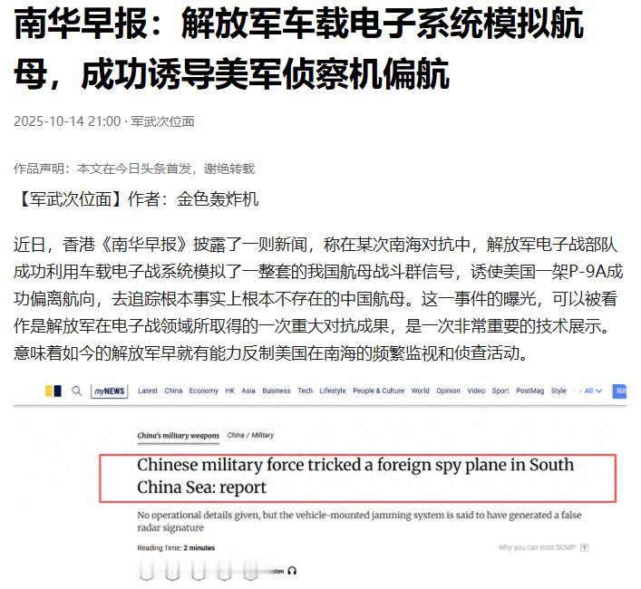美军傻眼了,解放军在南海布下电子陷阱,外国侦察机一头扎进假信号里,连目标在哪都找不到,真打起来美军雷达恐怕全废。 南海是咱们的重要海域,可总有些外国的军舰飞机不打招呼就闯进来。以前咱们可能拿他们没太多办法,现在可不一样了。 这次用的电子防御系统,说白了就是在海上搞了个"电子迷魂阵"。只要外国侦察机敢来,立马就会陷入假信号的包围圈。 就说这“电子迷魂阵”到底是个啥门道,其实原理说通俗点,就是先摸清对方侦察机的“脾气”,再给它喂假情报。 现代侦察机都是靠抓目标的电磁“指纹”干活,比如航母的雷达信号、通信频率这些特征,就跟人的指纹一样独一无二。 咱们的电子战设备能在毫秒内截获这些信号,相当于当场抄走了对方的“密码本”,再用同样的密码发假消息。 还有更厉害的是这些设备能把信号强度放大二十倍,一辆停在岛礁上的东风猛士越野车,就能模拟出十万吨级航母的雷达反射效果,让侦察机以为逮着了大家伙。 还能给假信号加运动参数,雷达屏幕上的“航母”不仅有坐标,还会以十八节的速度航行、转向,比真的还像那么回事。 今年九月下旬就出过这么一档子事,美军的P-8A侦察机号称“潜艇终结者”,兴冲冲来南海侦察,雷达屏幕突然弹出大型舰艇编队信号。 机组人员立马偏离航线十五到二十度,追着这“幽灵航母”兜圈子,折腾了四十五分钟才发现上当,海面上连个舰艇影子都没有,油料倒烧了大半,最后只能灰溜溜返航。 从头到尾咱们没出动一架战机,就靠一辆电子战车完成了“软驱离”,这操作可比直接拦截高明多了。 这款电子战设备部署时间是传统装备的五分之一,能量密度却高二十倍,一套能顶过去五十套老干扰器,内建的数据库里全是摸透了的敌方装备电磁特征,想骗谁就骗谁。 别以为这只是单一设备的功劳,现在南海的防御早成了一张网。空中的电子诱饵无人机能带着假信号满天飞,海上的军舰编队比如丹霞山舰、老铁山舰这些,训练时就经常和电子设备联动,遇到“敌”无人机立马组成防御阵位。 岛礁上的电子战车辆更不用说,隐蔽性强还能灵活机动,外军根本猜不到“迷魂阵”藏在哪。 去年五月美军RC-135侦察机闯训练区,南部战区就是靠空中兵力跟踪加电子监控,全程把它拿捏得死死的。 这种体系化配合有多厉害?举个例子,侦察机就算突破了第一层假信号,空中无人机马上补上新的虚假目标,海上军舰的电子战系统同时压制它的通信,到最后别说找目标,连自己在哪都未必清楚。 美军总觉得自家装备先进,比如P-8A装的AN/ALQ-240电子战防护系统,号称能抗干扰,结果在咱们的“迷魂阵”面前根本不好使,信号识别算法在复杂电磁环境里就是个摆设。 更有意思的是,这种电子战技术连美俄都羡慕,不是他们不懂原理,是缺稀土材料还没产能,小规模造几台贵得离谱,大规模列装根本扛不住,想抄作业都没地方下手。 十年前这还是科幻电影里的情节,现在咱们早就批量装备了,九三阅兵上那些信息支援设备,保不齐就有这款“戏耍”P-8A的家伙。 那些外国势力别以为还能像以前一样在南海横冲直撞,这张电磁防护网只会越织越密。侦察机来一次就被骗一次,油料耗光、任务泡汤是常事,真到了实战,这些被诱进伏击圈的侦察机就是活靶子。 南海从来不是谁的“后花园”,现在的防御体系既有单车骗航母的巧劲,又有海陆空联动的硬实力,无形的信号比真枪实弹更让偷窥者头疼。 这背后是技术的跨越,更是守护家门口的底气,不管谁想来搅局,最后都是竹篮打水一场空,毕竟在自己的海域,咱们有的是办法让不速之客知难而退。