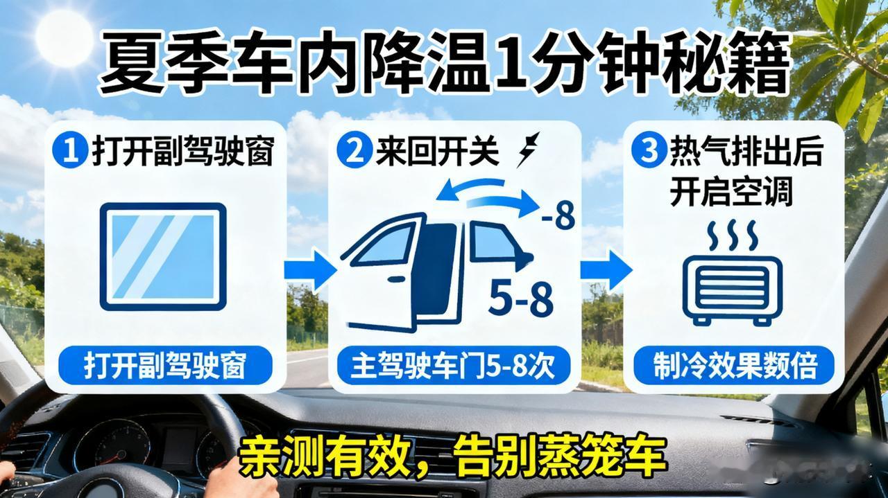 夏天车内像蒸笼?一分钟快速降温,不用等空调 副驾驶车窗打开,然后像扇扇子一样来回开关主驾驶车门5-8次,利用气压能把热气迅速排出去。亲测有效!再开空调制冷效果翻倍。小众但实用的小技巧,收藏了! 你还有什么夏季用车小妙招? 汽车开空调高温 汽车换气方法 汽车空调功能 汽车室内降温 汽车遮阳方式 suv驻车空调 夏天降温妙招