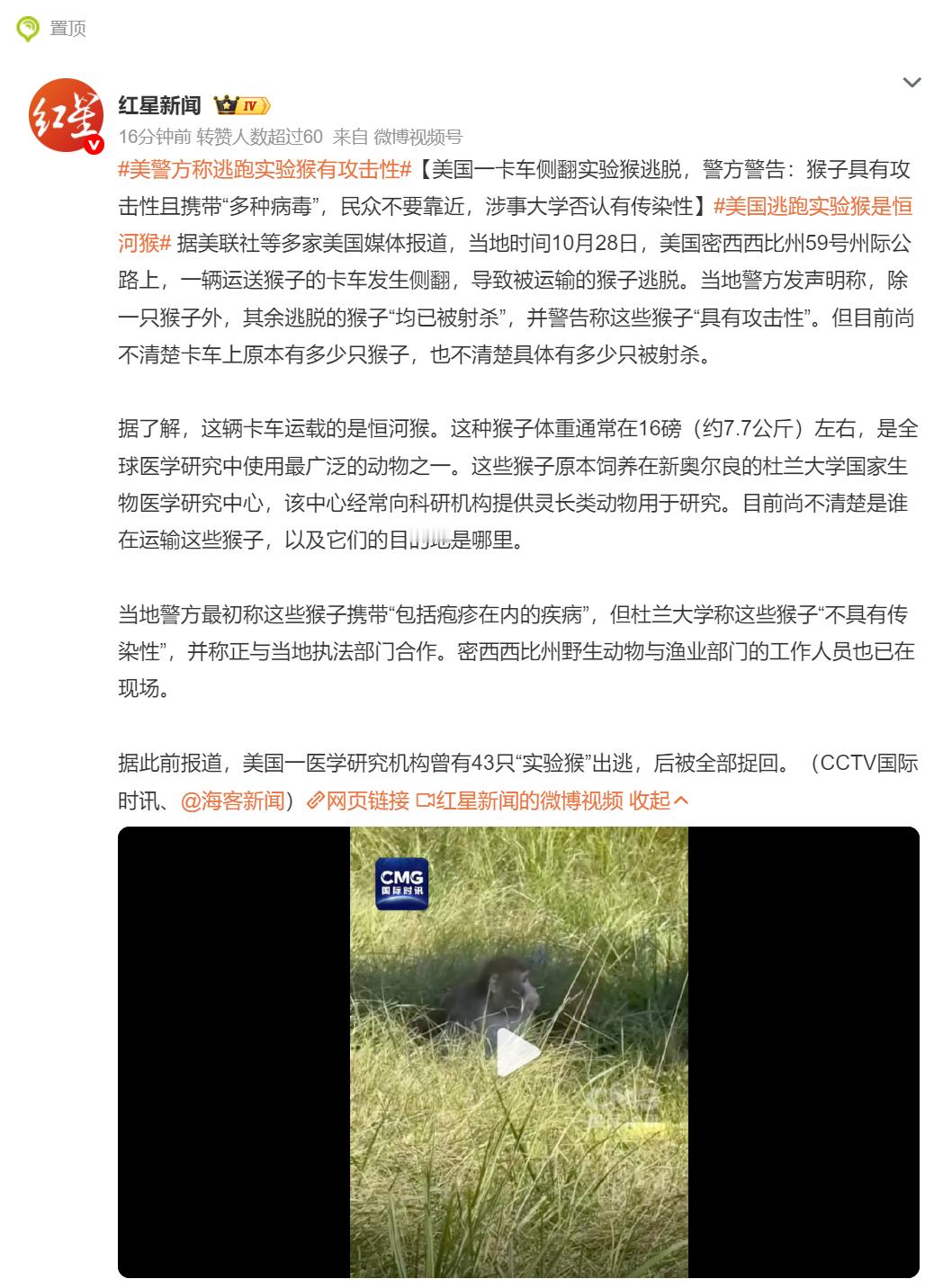 美警方回应运猴车翻车带病毒猴逃跑美警方称逃跑实验猴有攻击性海外新鲜事热点现场