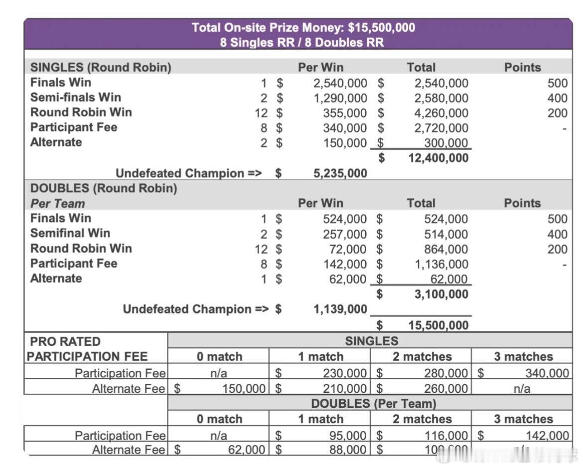 3️⃣超高的奖金设置,这可是在利雅得,总奖金高达1550万美金;以全胜战绩夺冠的单打选手将获得523.5万美金奖金;而仅输掉一场循环赛的冠军选手,奖金仍高达488万美元。