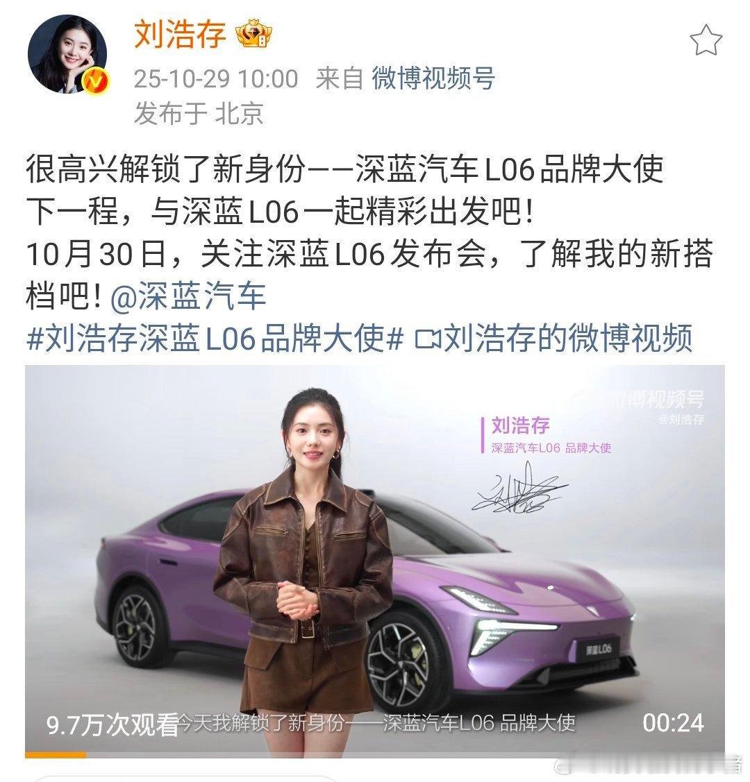 刘浩存正式官宣深蓝汽车 L06 品牌大使,车代美美拿下😋