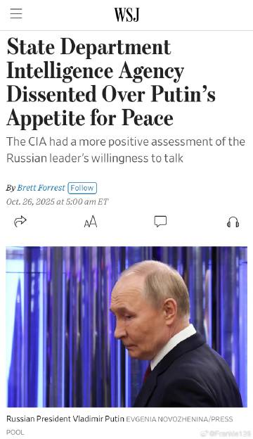 《華爾街日報》 :美國國務院懷疑普京是否已準備好就烏克蘭問題進行和談該報報道稱,美國國務院情報與研究局(INR)並不認同中央情報局對可能進行談判的樂觀看法。《華爾街日報》指出,兩家機構分析師之間的分歧甚至在川普與普京阿拉斯加峰會之前就已經顯現,並反映在美國總統的每日簡報中。