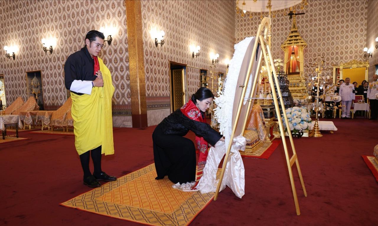不丹国王夫妇现身泰国,祭拜诗丽吉太后 10月29日上午10点,不丹国王吉格梅·凯萨尔·纳姆耶尔·旺楚克与王后吉增·佩玛·旺楚克现身大皇宫杜斯特·玛哈·普拉萨王座大厅,向诗丽吉太后骨灰瓮敬献花圈,并在瓮前签名,深情表达哀悼。 今晚,国王还将出席大皇宫王座大厅的皇家功德仪式与诵经活动。不丹国王与泰国王室交好,对诗丽吉王太后极为敬重。此次不丹国王夫妇前来参拜,泰国人民满怀敬意,由衷感谢他们的深情厚谊。